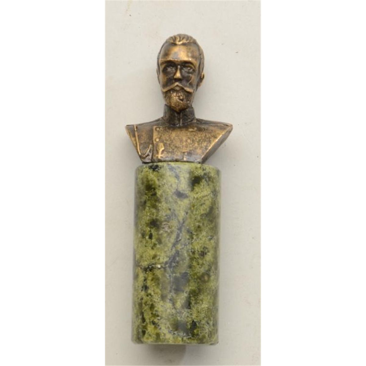 Small bronze on greenstone base signed F.G. on reverse and dated 1910. Possibly Czar Alexander from his photos. Measures 4-1/8" in height, excellent quality. Stone is type found on eastern European bronze bases.Est.: $150 - $300+++