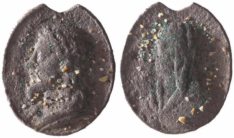 Small bronze religious medallion. 3.68 grams, 20x18mm. Dark, corroded and encrusted with small bits of shells, yet with fairly bold portraits of saints on both sides, loop at top broken off before salvage. Recovered from: Spanish 1715 Fleet, east coast of Florida