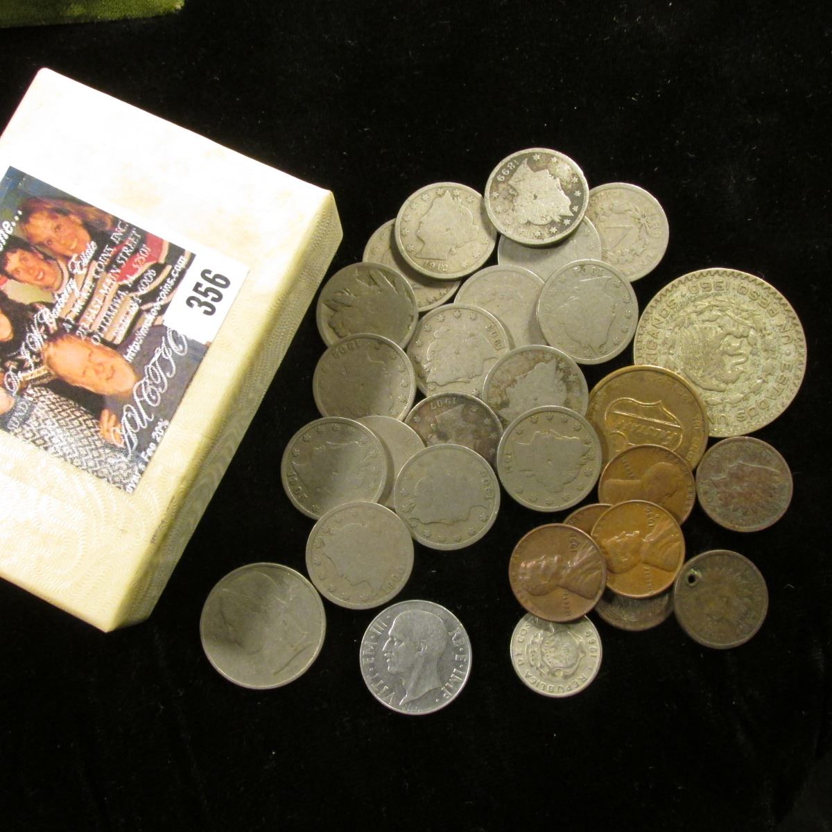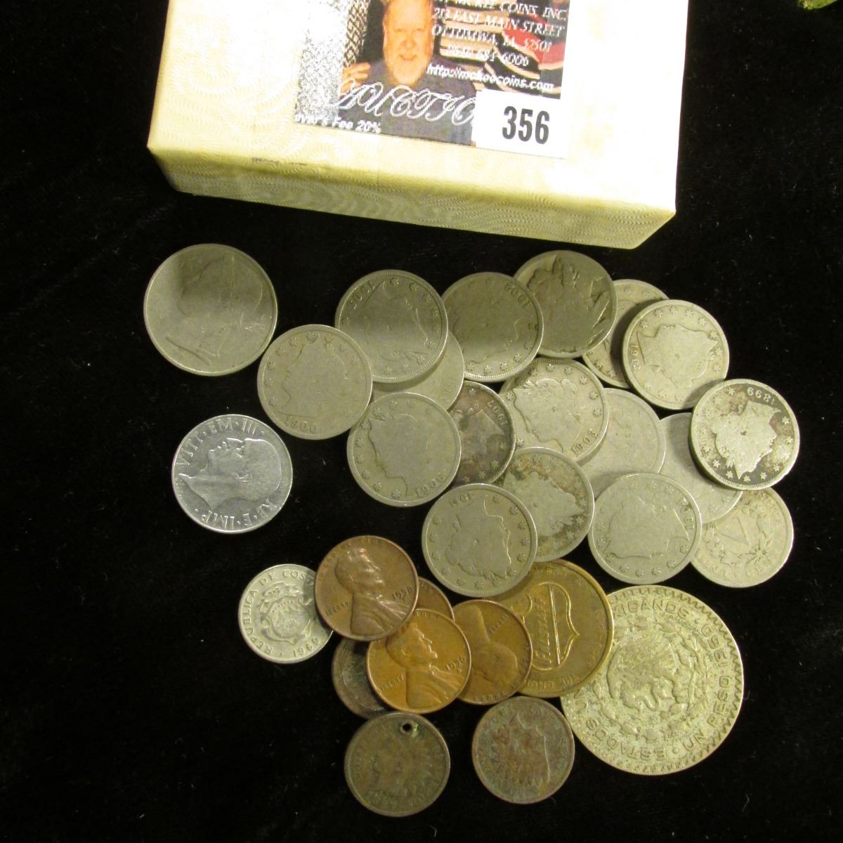 Small cardboard box of miscellaneous Coins, including (2) Indian Cents (one holed); (4) Foreign Coins including a Silver Mexico Peso; 1903-53 Falstaff Medal; (5) Wheat Cents; dateless Buffalo Nickel; Liberty Nickels: 1883, (2) 1899, 1900, 02, 03, 04, 05, 06, (3) 07, 09, 10, 11, & 12 P.