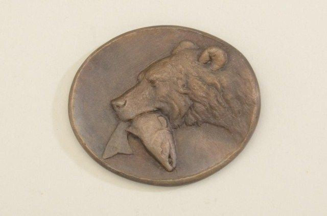 Small cast bronze disc by famed Western artist Michael Coleman of a bear with salmon in his mouth approx. 2” x 2-1/2”. Coleman’s work is known world-wide and displayed at places like the Buffalo Bill HistoricalCenter in Cody, Wyoming. Est.: $50-$75.