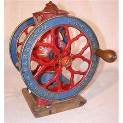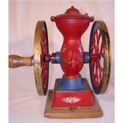 Small cast-iron red & blue original painted coffee grinder. Marked on wheels "The Cha's Parker Co.-Meriden, Conn., U.S.A." Stands 12" tall. Drawer has been replaced and a few decals are missing.