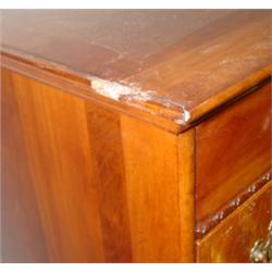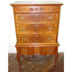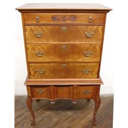 Small cherry flat-top high boy. Measures 54 1/2" tall, 32 1/2" wide, and 20" deep. Missing 1" piece of molding on top left. Has shell carvings on knees and dovetailed drawers.