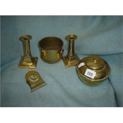 Small collection of brass items including pair of candlesticks