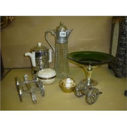 Small collection of plated and glass items including claret jug and tazza