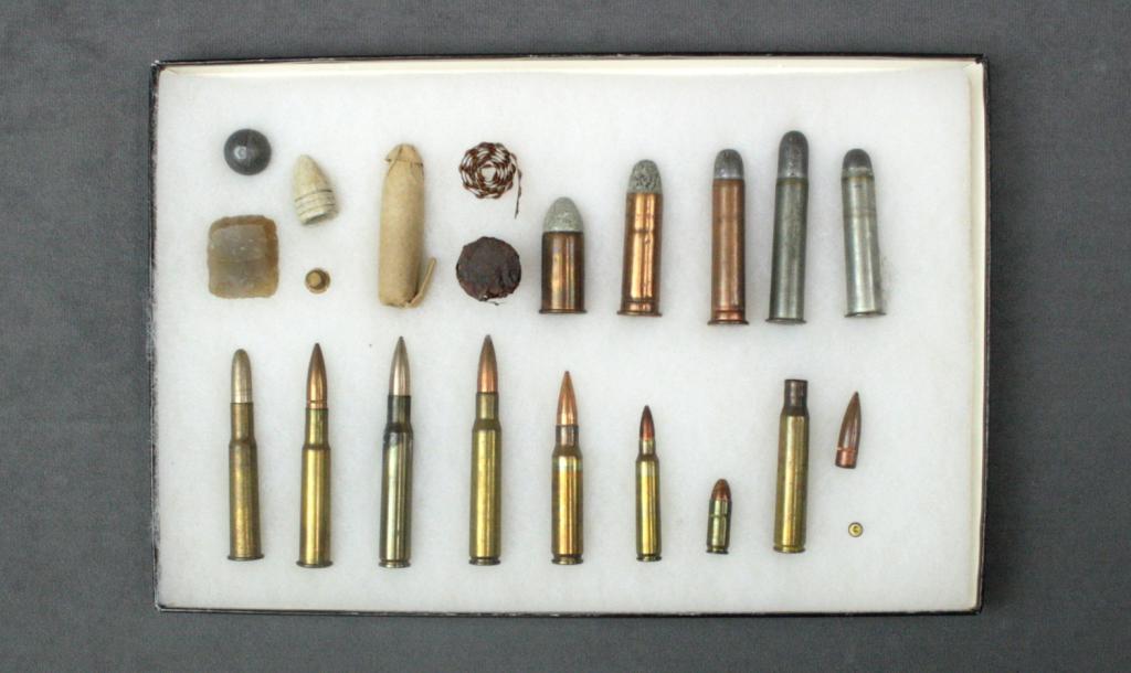 Small collector’s lot of military example cartridges and misc. items in riker case including two tape primers, a .58 paper cartridge, a .58 cal. rim fire cartridge, a .50-70 round, several different types of.45-70, several types of .30-40 Krag cartridges and a number of .30-06 rounds, etc. A great display for the military aficionado. Est.: $50-$100.