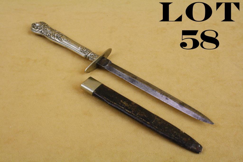 Small cutlery style dagger and leather sheath approx. 9” overall with an approx. 5” blade marked “G. Woodhead, Sheffield Warranted”; the knife is overall good with a couple areas of erosion; the cross guard is a simpleGerman silver oval and the cutlery style grip is tastefully accomplished and in overall good condition; the sheath is in overall fair to good condition showing wear and scuffs with some of the gold bordering stillvisible; metal throat of sheath is present, metal tip is missing. Est.: $200-$400.