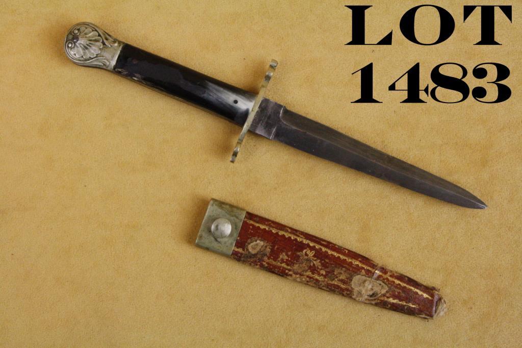 Small dagger and sheath approx. 8” overall with an approx. 4-1/2” blade marked “S. Butcher, silver steel, Sheffield”, horn grip that shows several losses on both sides; cross guard and decorative pommel shellpattern panels; blade has been cleaned and has gone back to a gray patina; sheath is worn, has some loss areas and is missing the tip; the throat with its hanger button remains as does approx. 70% of the golddesign work on the outside of the sheath’s body. Est.: $200-$400.