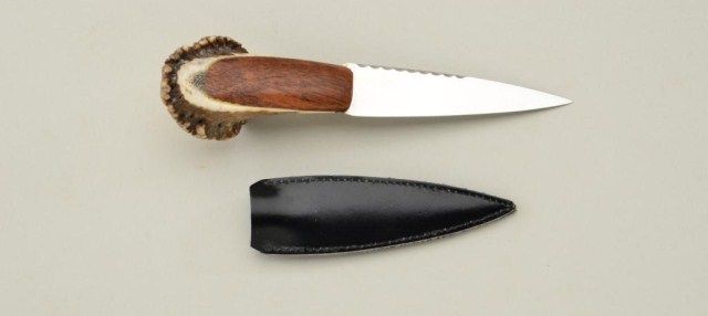 Small dagger with beautiful stag grip, approx. 6-1/2” overall in fine condition with leather sheath; blade marked “G.B. Wilson Pitlochry, Scotland” and “Stainless Steel”. Est.: $75-$150.