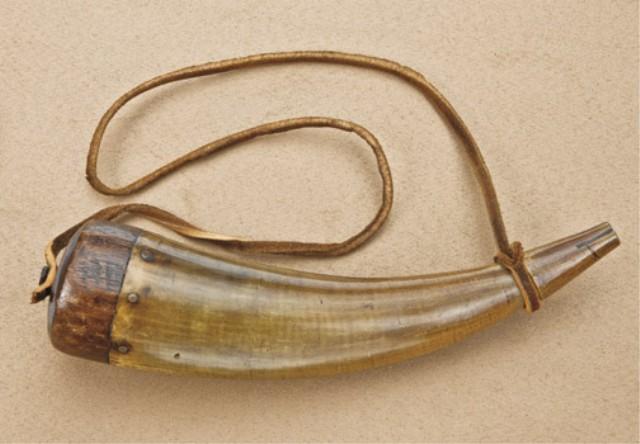 Small early 19th century priming horn of American style measuring 8” from tip to end of plug. Shows good patina and an oversize wood plug. Some light carving that is worn down and illegible. Est: $100 - $300