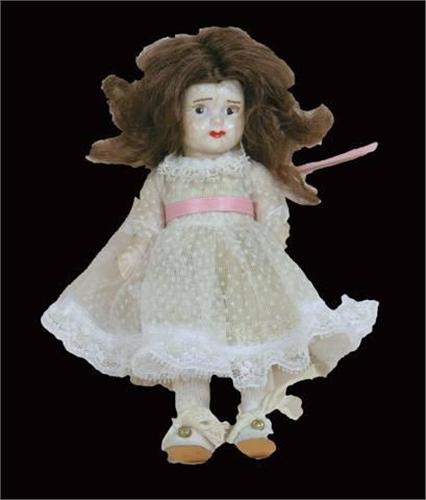 Small early porcelain doll, 7 inches tall, white dress. Good Cond.