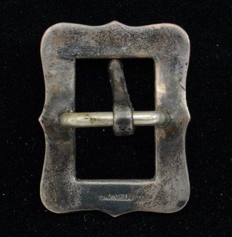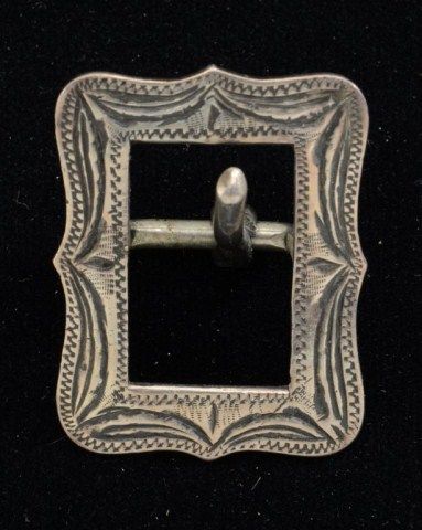 Small finely engraved buckle marked “Sterling” on back, approx. 1-1/2” x 1-1/4” in overall very good condition with a nice patina; from an old collection. Est.: $25-$50.