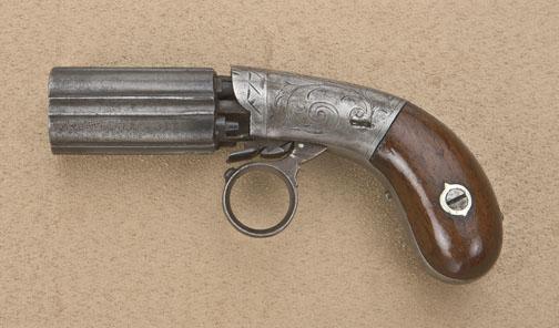 Small frame, bag shaped grip Blunt & Syms Underhammer pepperbox ring trigger revolver, .28 cal., 2-1/4” barrels, blue finish, engraved frame, wood grips, #NVSN; “RC” marked on the face of the muzzle of thebarrels. This gun is in overall good condition showing a grey patina to barrel assembly, pleasantly engraved frame, fair action, two replaced percussion nipples (other three original); dark bores, good wood grips with some scattered nicks and mars from carry and storage. Desirable in this frame size. Est.: $500-$1,000.