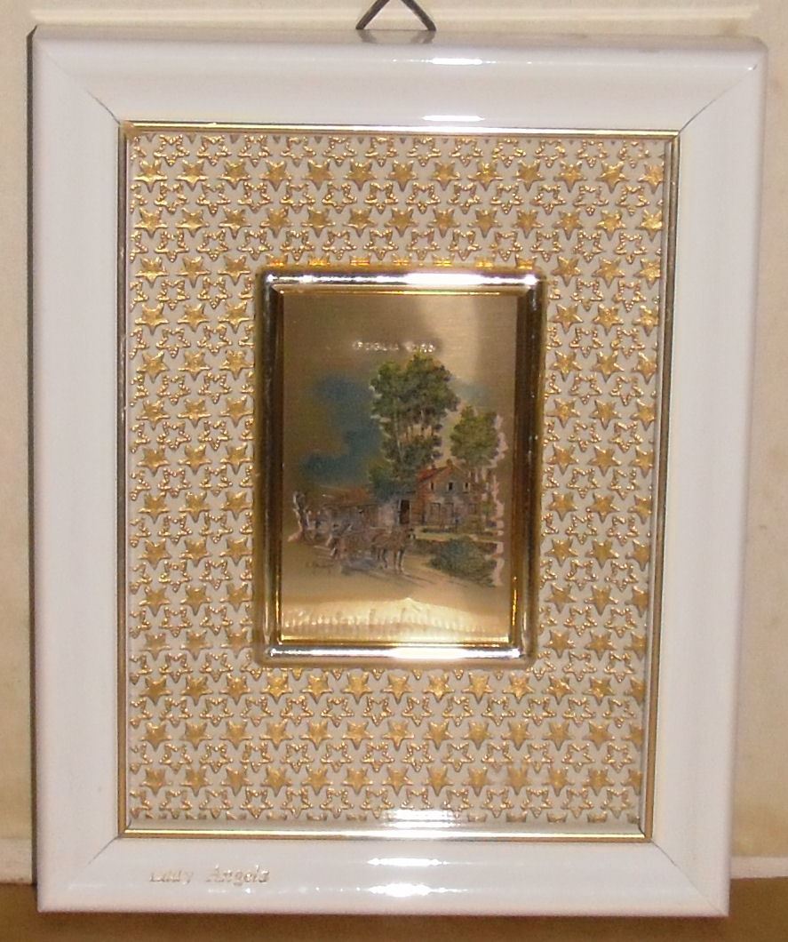 Very small 23 kt gold leaf, picture by Oro Foglia chromolithograph Framed about 6 x 5 inches - house, horse, cart and people scene;