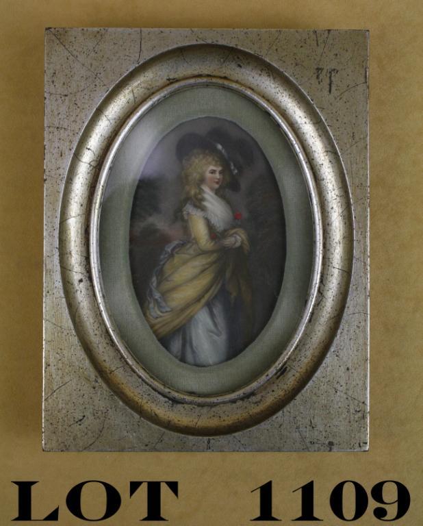 Small framed color drawing of a noble woman in fancy dress and hat, image size approx. 5” x 3” and overall, approx. 9” x 7” in overall good condition and with note on back of frame “Georgiana, Duchess of Devonshire”.Est.: $45-$65.
