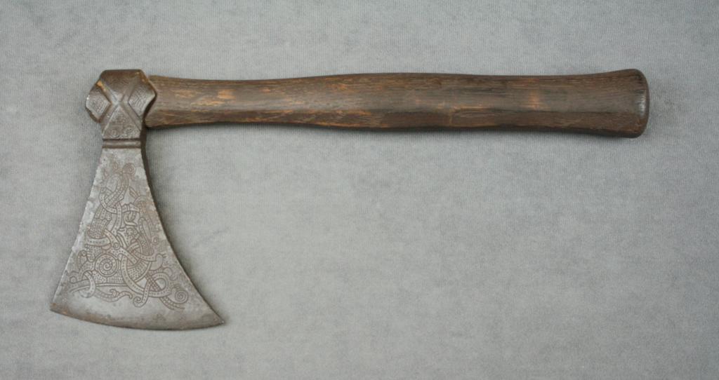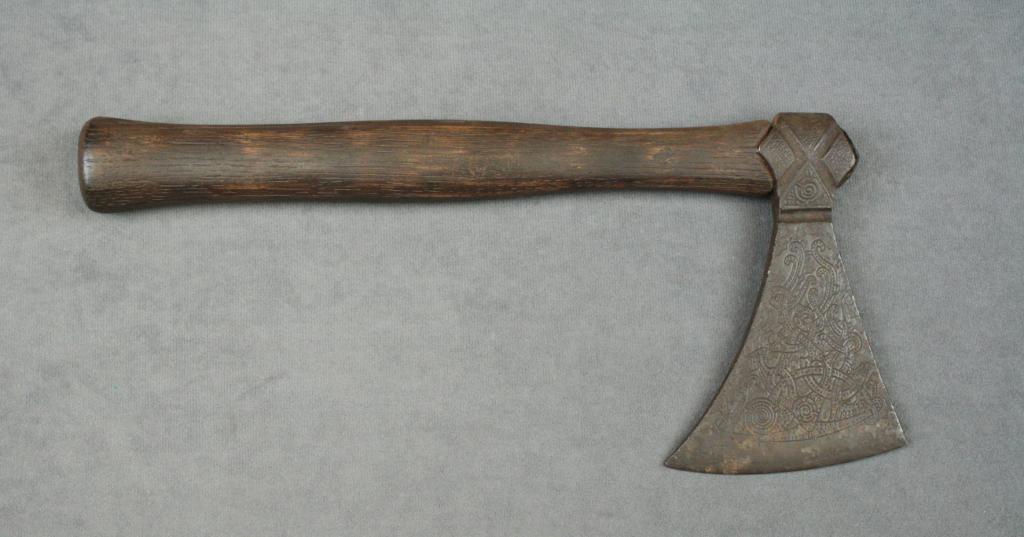 Small iron hand axe with wood handle; axe is approx. 6” overall with an approx. 4” width of blade showing interesting design work, brown patina, wood shaft is approx. 13” overall and appears to be later than thehead. Est.: $50-$150.