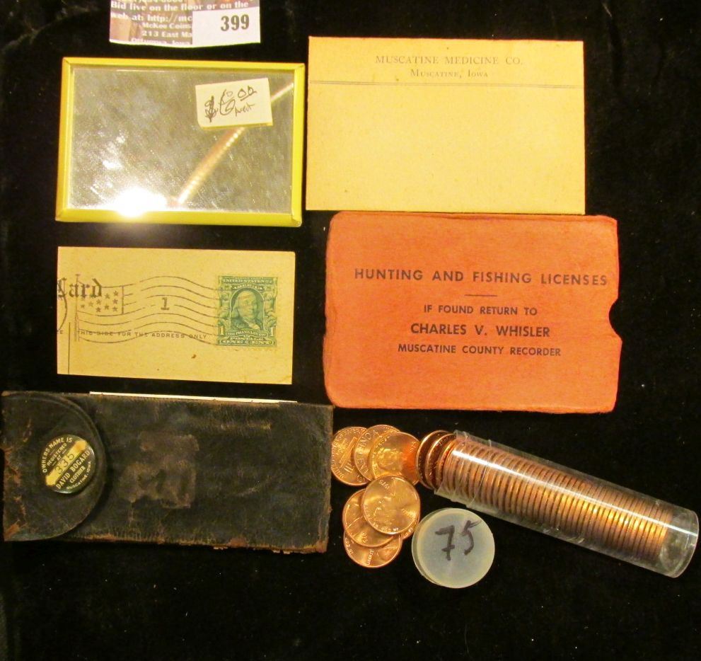 Small leather Billfold with pin-back "David Bogard Clothier Muscatine, Iowa"; Hunting and Fishing License holder "Muscatine County Recorder"; Ben Franklin one cent stamp with flag cancel; advertising mirror "Melon City Antique Mart…Muscatine, Iowa…"; "Muscatine Medicine Co. Muscatine, Iowa" license envelope; & 1975 P Solid date Roll of BU Lincoln Cents.