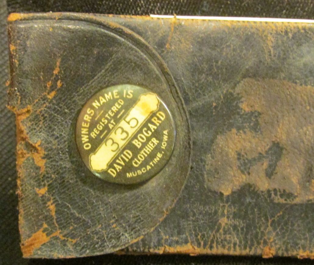 Small leather Billfold with pin-back "David Bogard Clothier Muscatine, Iowa"; Hunting and Fishing Li