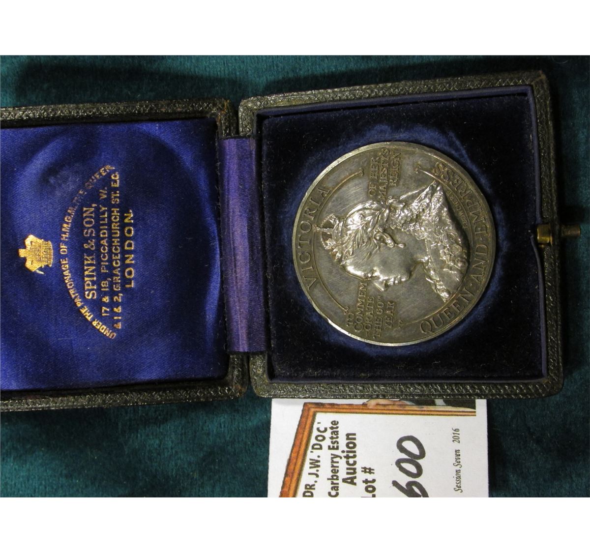Small leather bound box labeled "Wateringbury June 22 1897" on the outside and "Under the Patronage of H.M.G.M. the Queen/Spink & Son, …London" on the inside, which contains a Proof Silver Medal "Victoria/To Commem/orate/The 60th/Year/of Her/Magesty's/Reign/Queen and Empress", rev. "May The Blessings of Peace Continue to Crown Your Glorious Reign/Spink London...", depicts Angel with two wreaths. Darkly toned. 39mm.
