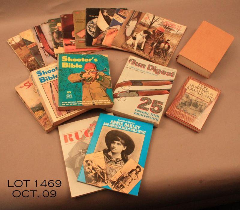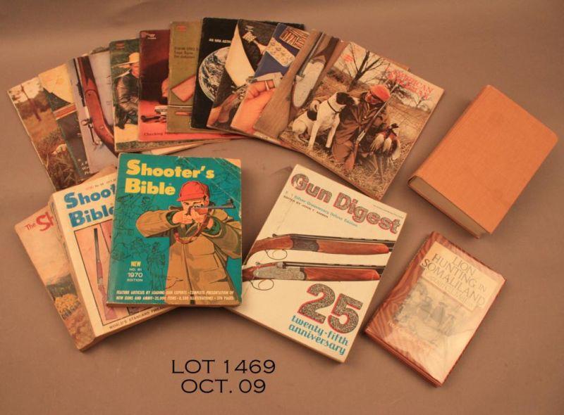 Small lot of Shooter’s Bibles, Gun Digest, American Rifleman magazines and several hardcover books including the S & W Collector’s Special 1977 Edition of the 125th Anniversary, Complete Guide to Hunting Across North America by Dalrymple, Manand Beast in Africa, by Sommer, an original Stoeger 1936 catalog, etc. Est.: $50-$100.