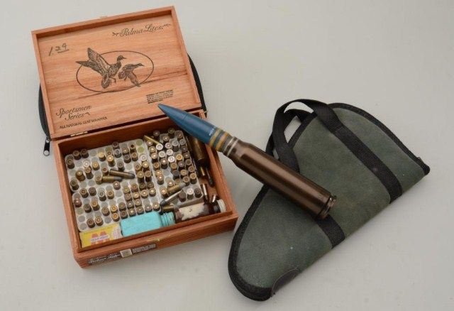 Small lot of collector ammo including two boxes of Justice .380 and a partial box of same, with a box of Remington .357 Magnum; also a wood cigar box of misc. collector cartridges with misc. soft gun boots, aninert large shell, etc. Est.: $50-$75.
