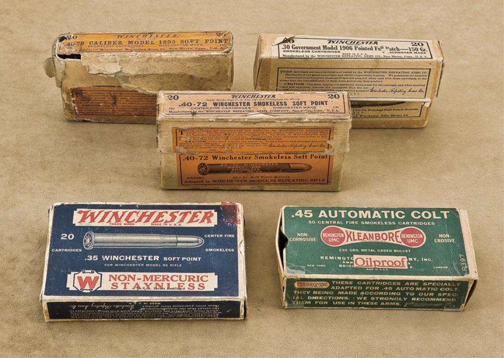 Small lot of collector ammo (not for firing) including a box of Winchester .35 soft point; a box of Remington-UMC “Dog Bone” green and red lid of .45 automatic Colt; a box of Winchester 40-72 smokeless soft point in the two piece orange label box; plus additional partial boxes and loose rounds and brass only for 40-72, .30 Gov’t, 25-20 Winchester, .33 Winchester, .348 Winchester, .35 Winchester and early .32 RF. Est.: $300-$600.