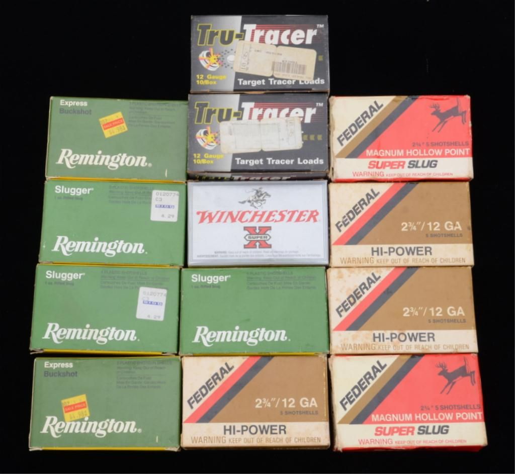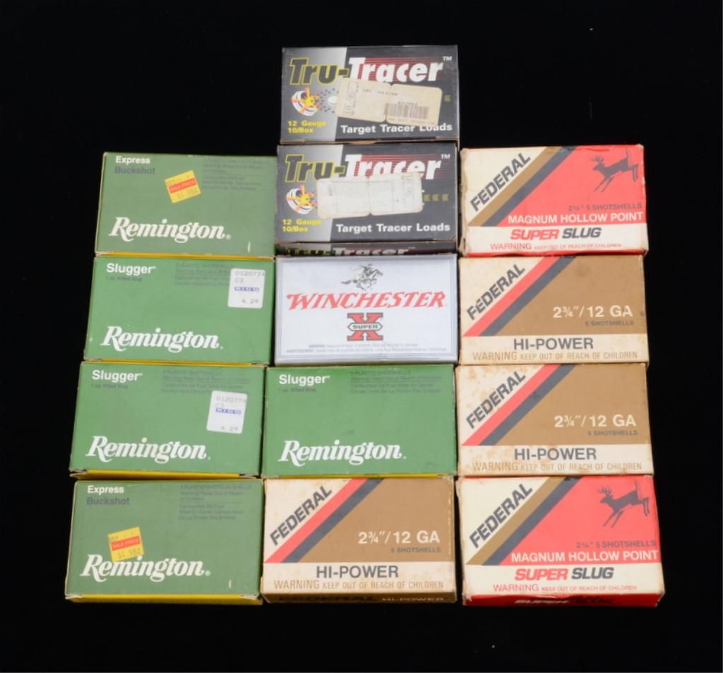 Small lot of misc. 12 gauge ammunition, approx. 75 rounds, by various makers including Federal, Remington and Winchester; includes buckshot, slugs and training ammo. Est.: $50-$75.