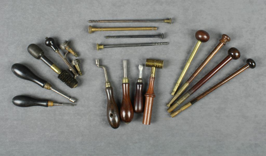 Small lot of misc. loading tools including  many that would go with cased sets of  percussion pistols in overall good to fine  condition.  Est.:  $150-$300.