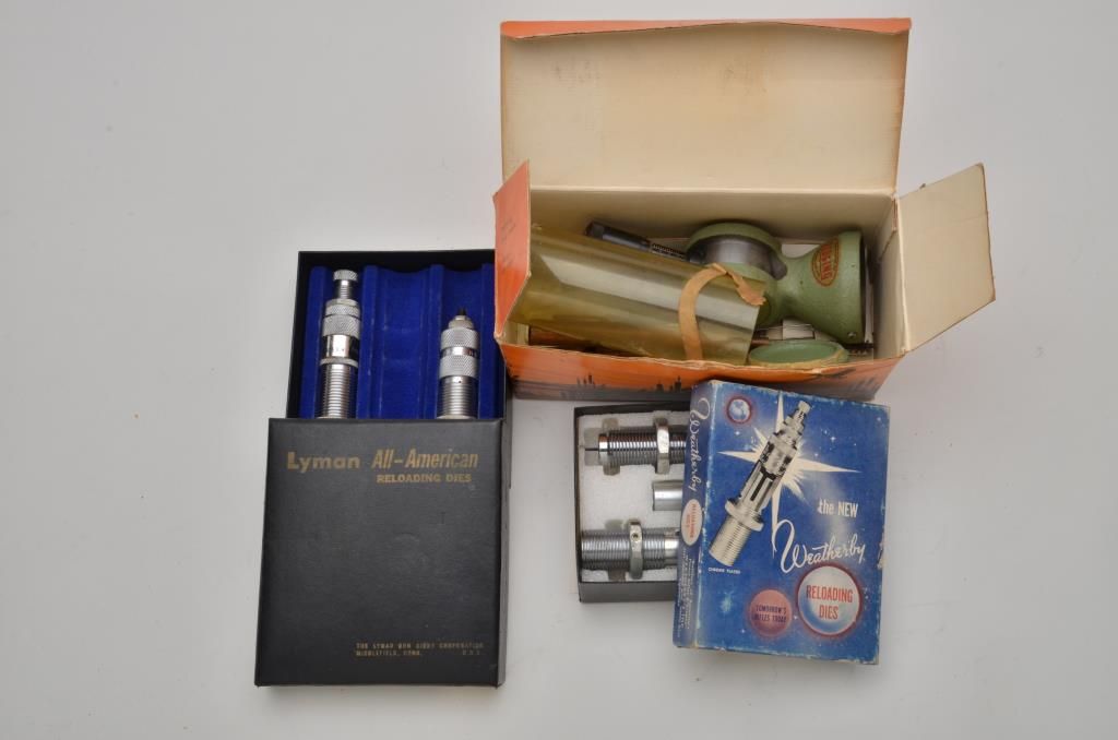 Small lot of misc. reloading dies and accessories, dies include .225 Win., .308, .22-250, .44 Mag., .222, .30-06, .30-30, 7mm Mauser, .257 Roberts, a micrometer and a powder measurer. Est.: $150-$300.