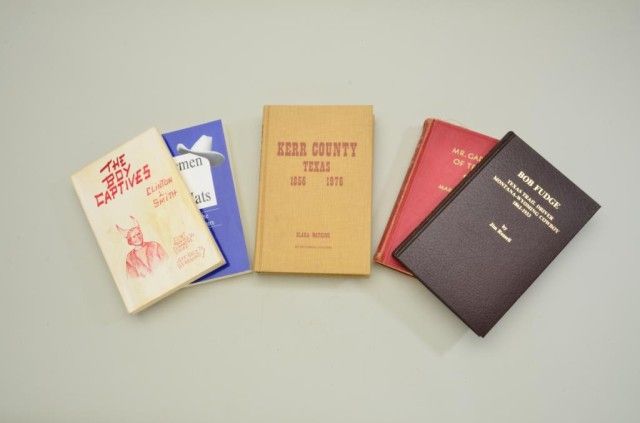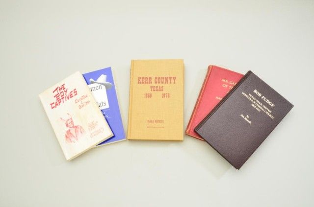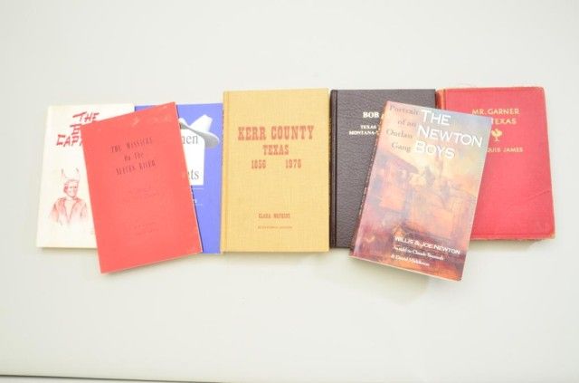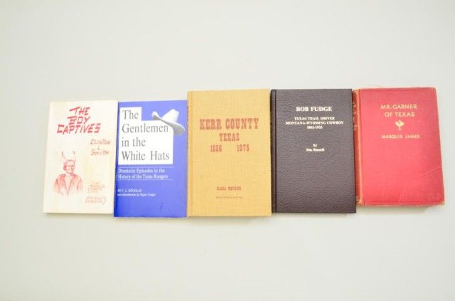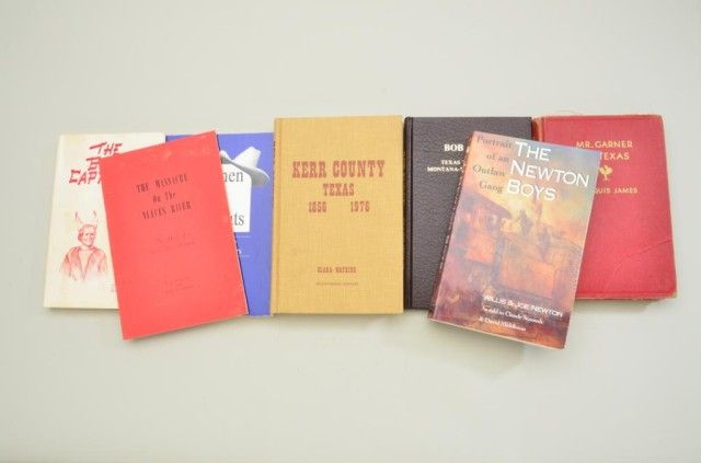 Small lot of mostly out-of-prints books on historical figures of Texas, previously in the library of noted Texas rancher and collector, Charlie Schreiner III including The Flamboyant Judge, James Hamlin, BobFudge, Texas Trail Driver, Texas Cowboys by Charlie Siringo, The Gentlemen in the White Hats (Texas Rangers), The Newton Boys, etc. Est.: $75-$150.