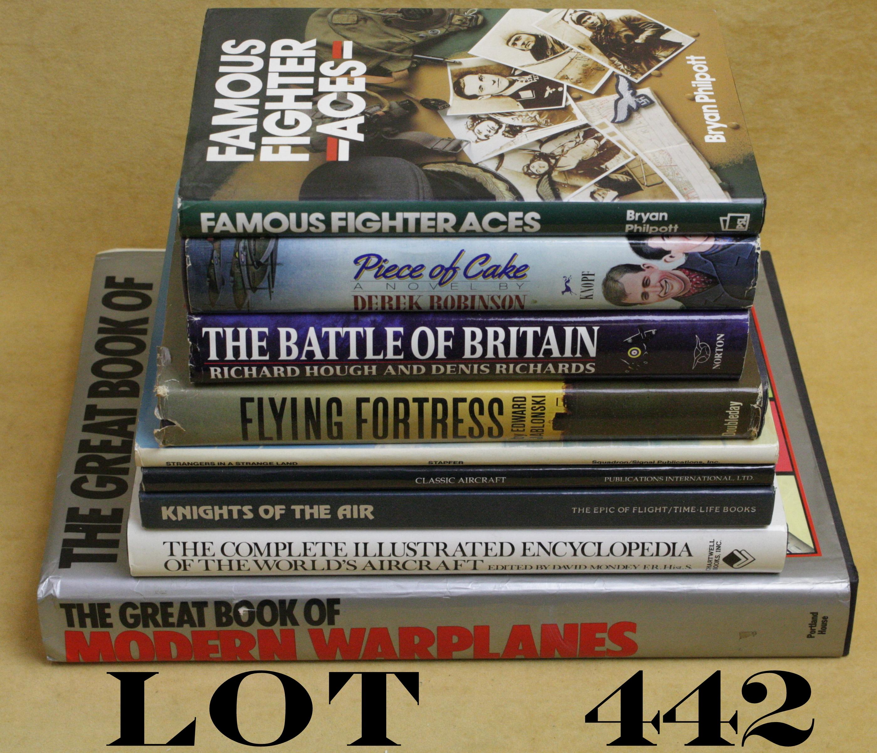 Small lot of reference books and soft covers on primarily military aircraft including g The Great Book of Modern Warplanes by Salamander Books; Famous Fighter Aces by Philpott; The Complete IllustratedEncyclopedia of the World’s Aircraft by Mondey; Battle of Britian by Price, etc. Est.: $50-$100.