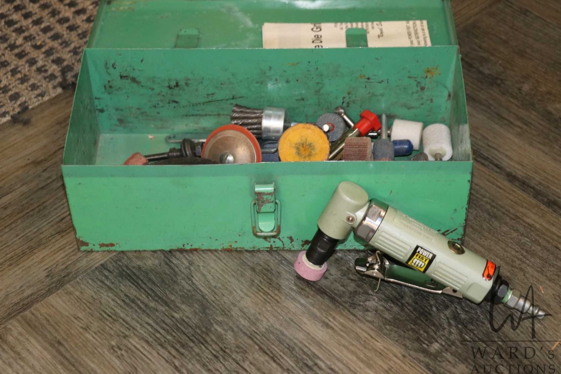 Small metal tool box with Powerfist air die grinder and assorted grinding and cutting tools