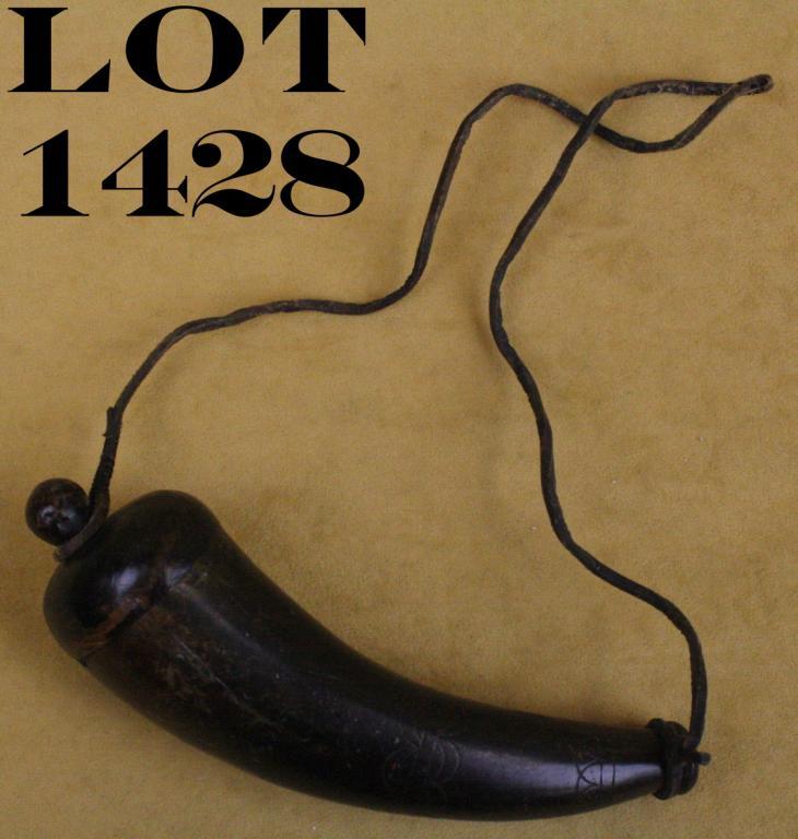 Small old carved powder horn approx. 8” overall showing a dark patina and two carved design areas circling the top portion of the horn with old wood plug and leather carry cord. Est.: $150-$300.