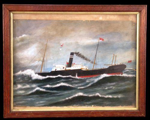 Small painting of an early ship w/ early photo on back a group of men with ribbons may be a fraternal organization