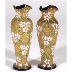 Small pair of Royal Doulton Slater's patent vases with frilled necks, hand enamelled with flowers onto a gilt and brown ground, marks to base, 18cm high