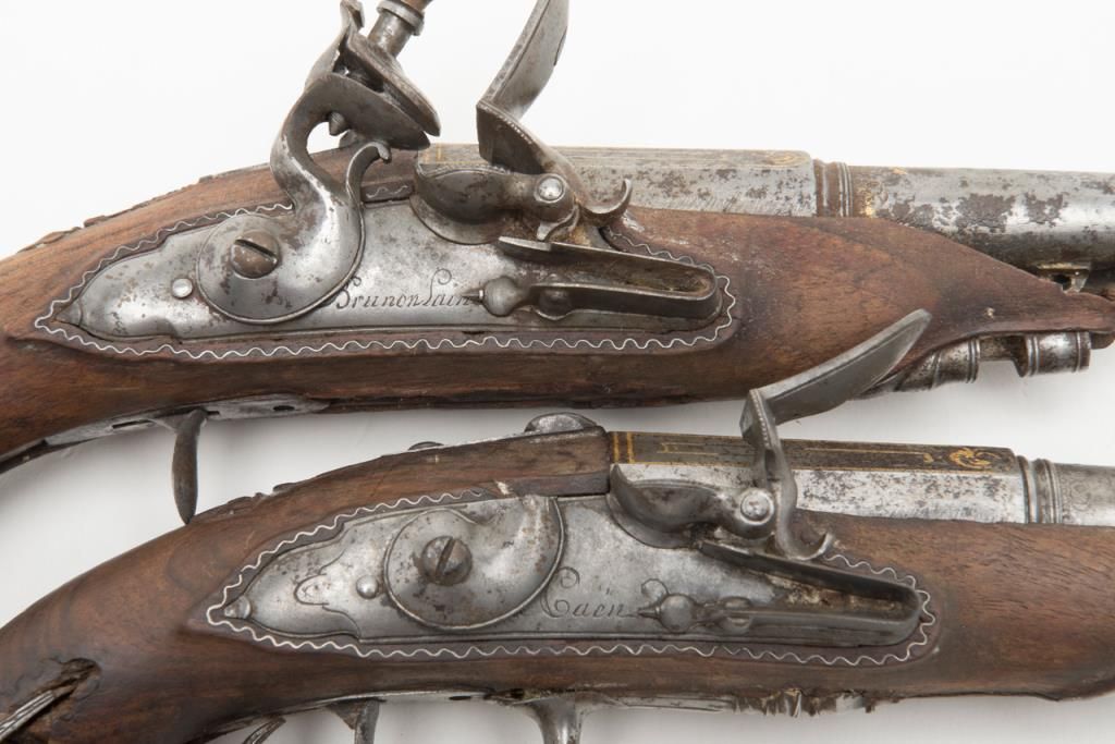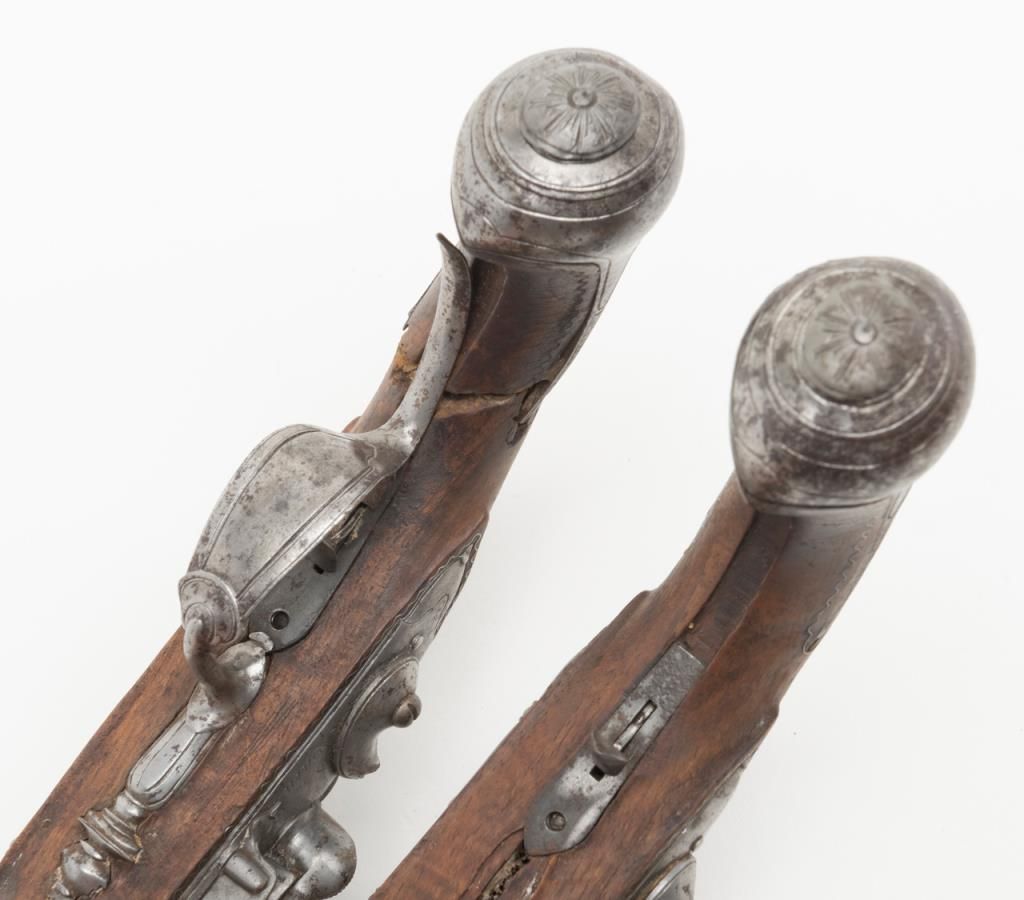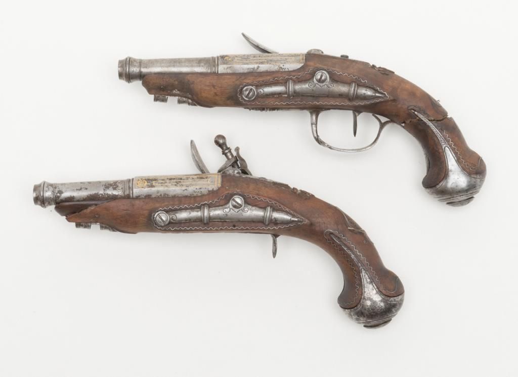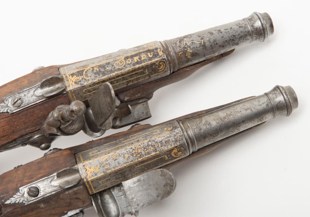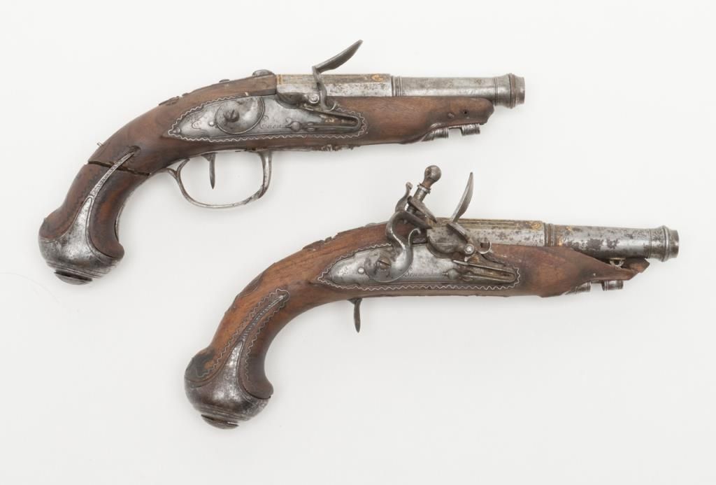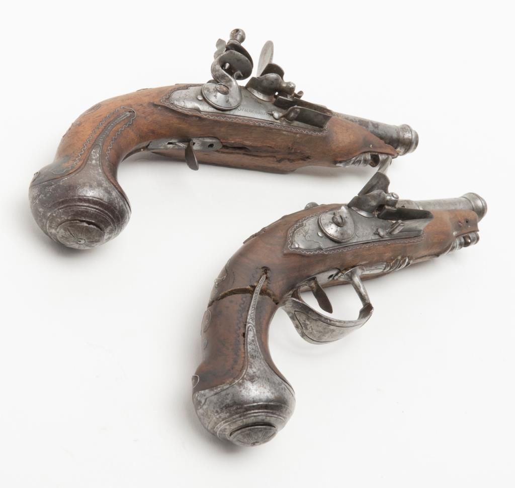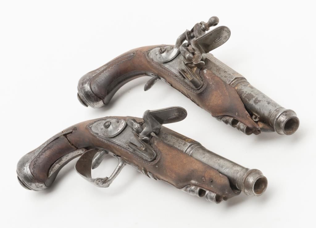 Small pair of cannon barrel flintlock pistols in need of restoration; each approx. 9” overall with 4-1/2” barrels marked “Cn Gordu”, lockplate marked “Srunon Lain”. One has a grip that is broken at the wrist, missing the top half of the hammer andmissing the ramrod; the other is missing the trigger guard, ramrod and a portion of the front tip of the fore stock; action on this one of the pair is working crisply. (Antique). Est.: $250-$450.