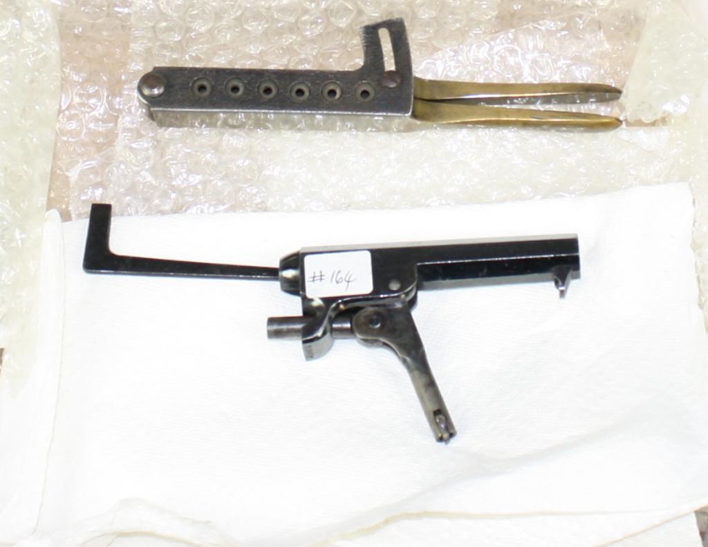 Small parts lot including an excellent condition 4” Colt percussion Model 1849 barrel assembly and rammer showing the majority of original blue and case hardening on the rammer that is non-factory engraved,#318417 with fine bore; a fine conditioned combination screwdriver and a rare Colt’s Patent brass gang mold in overall fair to good condition. Est.: $400-$600.
