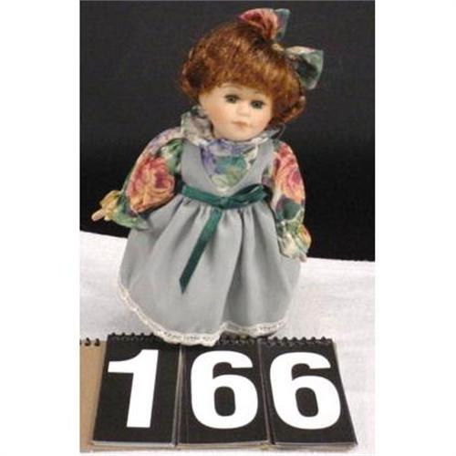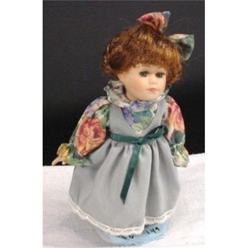 Small porcelain doll with brown hair green dress and colorful shirt. Doll is in good condition and measures 9 inches high and weighs 7 ounces. [149]