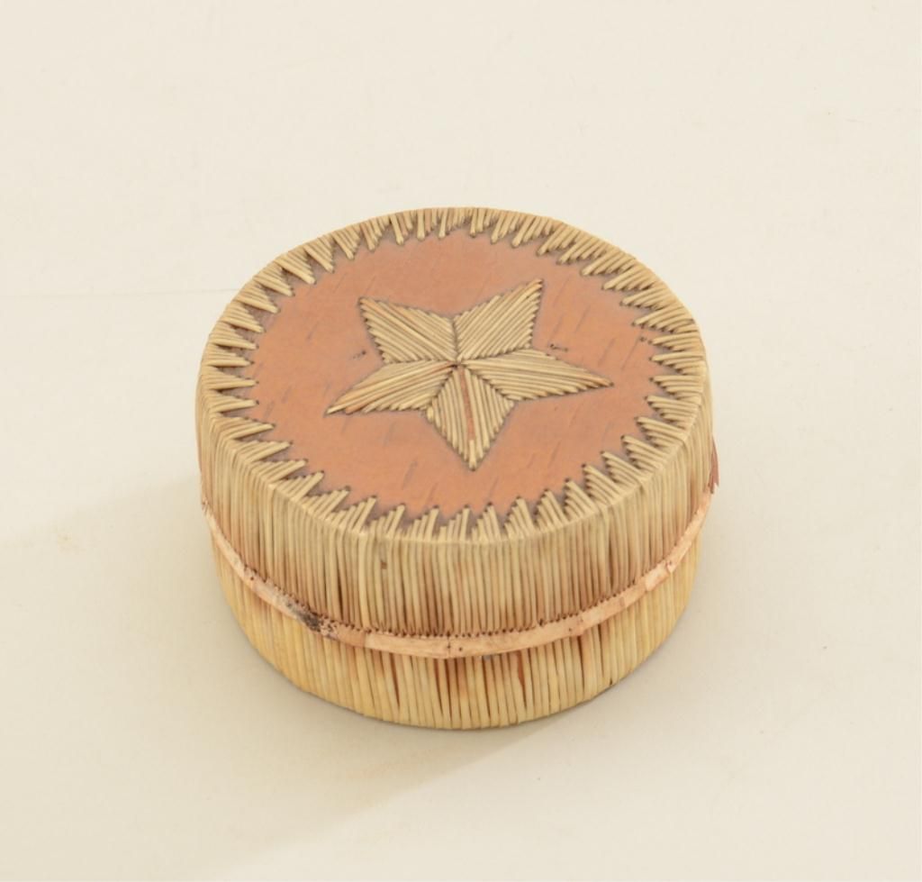 Small porcupine needle quill and wood two piece circular basket, approx. 2” in height and approx. 3-1/2” in diameter; in overall fair to good condition with some slight damage to lid rim. Est.: $50-$100.