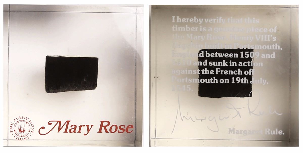 Small section of wooden timber inside an acrylic cube signed by archeologist Margaret Rule, very rare provenance. 144 grams, 2" x 2" x 2". Henry VIII's flagship Mary Rose, sunk in the Solent north of Isle of Wight, remains one of the most important monuments of nautical archeology, from its discovery in 1971 to its salvage in 1982, its hull and artifacts still on display locally and still being researched and conserved. Until this little promotional piece came to us (a small cube of black wood with certification printed on the surrounding acrylic), we were unaware that any pieces of the ship were sold this way, and we are unable to locate another example for price comparison.