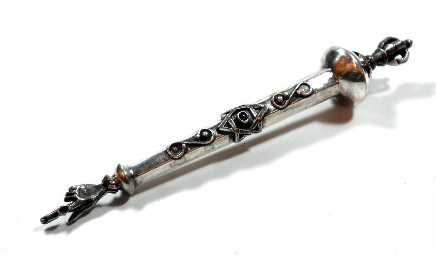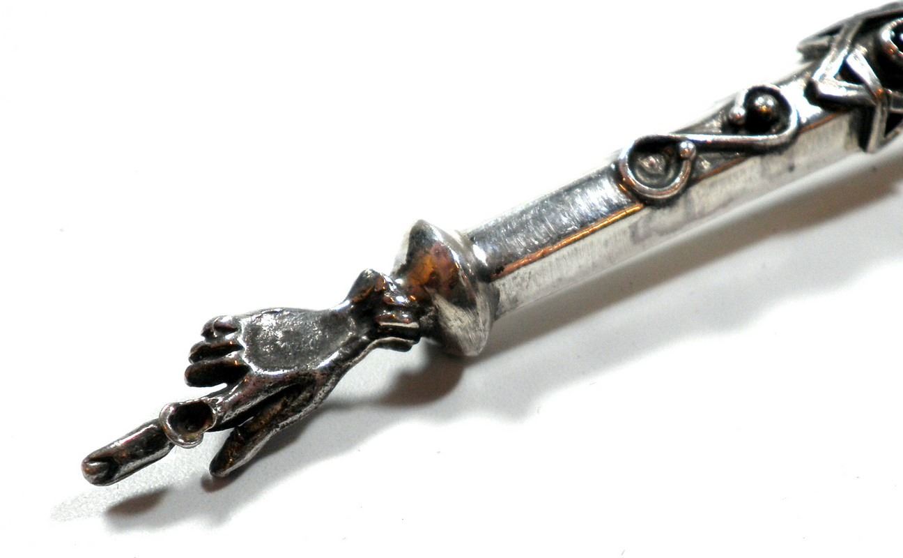 Small silver Torah book pointer, embellished at the handle with a Torah crown, and a Star of David with gemstone setting in the middle, signed, weight: 21.9 gm, length: 15.5 cm.
