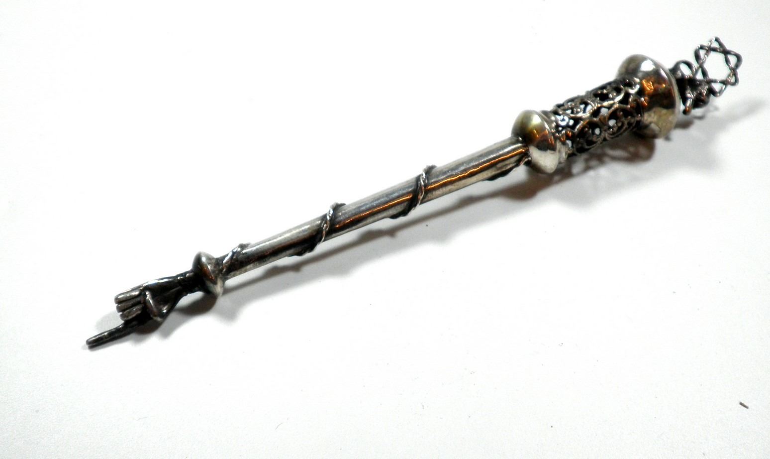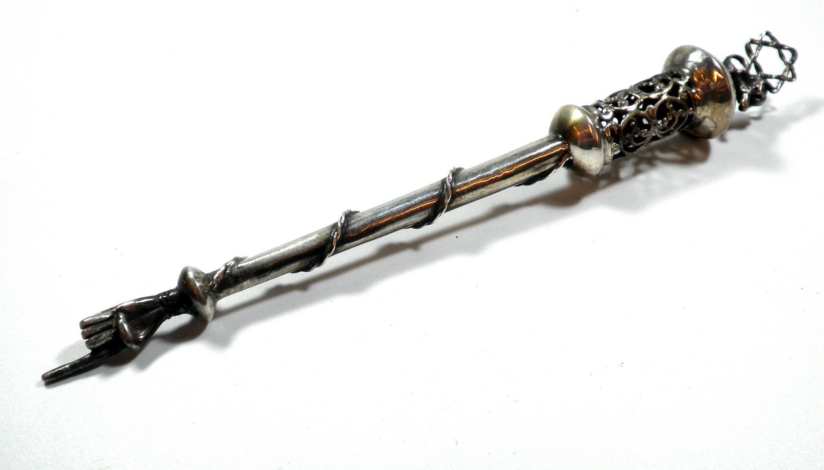 Small silver Torah book pointer, handle embellished with the figure of a lion and a Star of David, signed, weight: 20.2 gm, length: 18 cm.