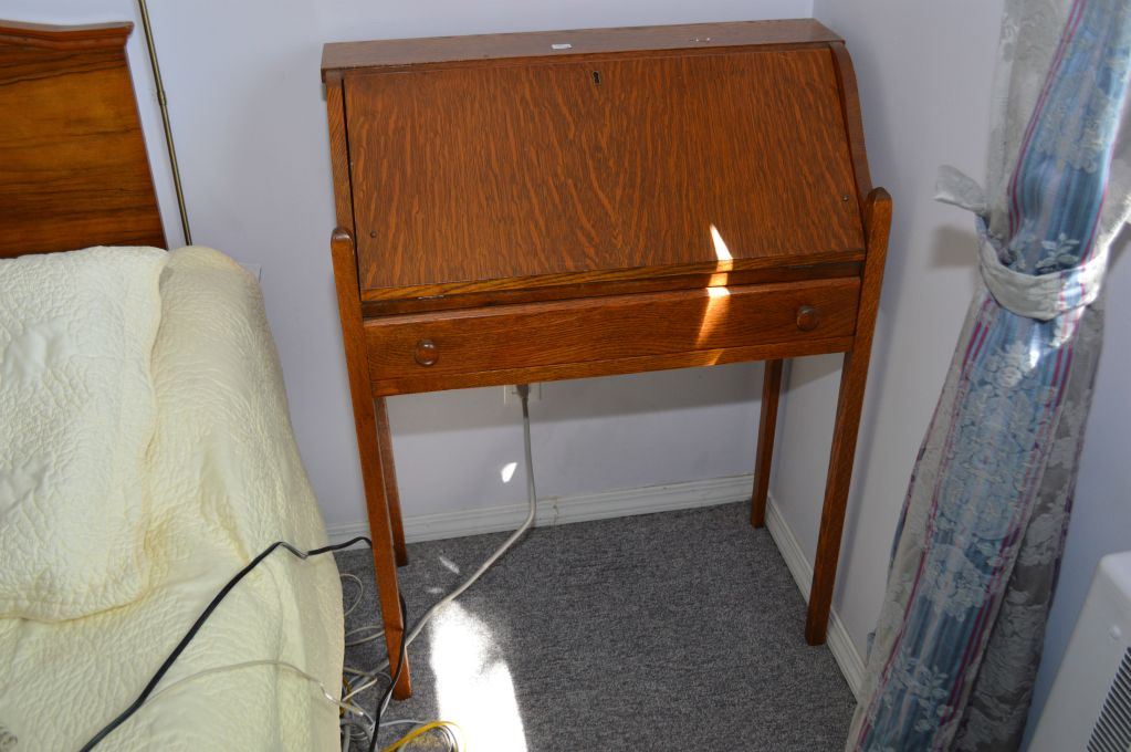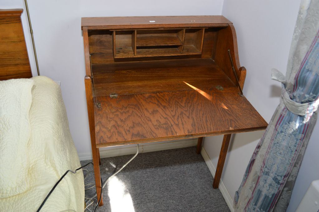 Small single drawer quarter cut oak drop leaf desk with partially fitted interior