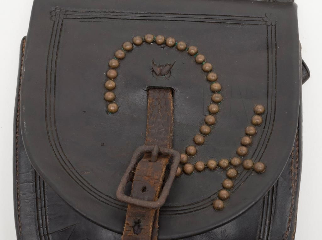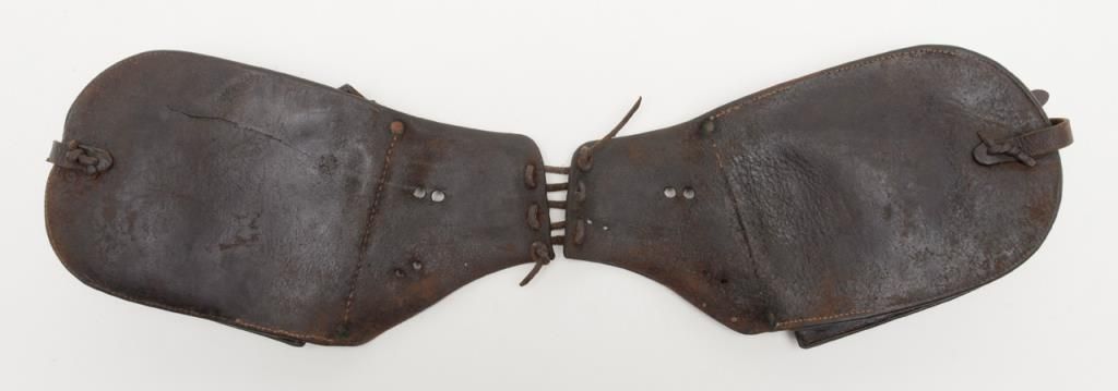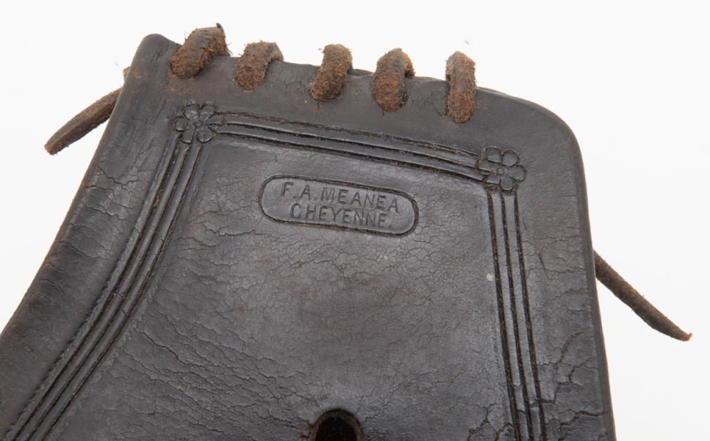 Small size pommel bags for gold coin or mail, marked F.A. Meanea, Cheyenne. Showing 2/4 intertwined initials which was probably a brand. Good condition. Normal cracking and aging. Extra holes punched for secure attachment tosaddle. Either coin or documents were not wanting to be lost on a fast ride. Est.: $500-$1,000.