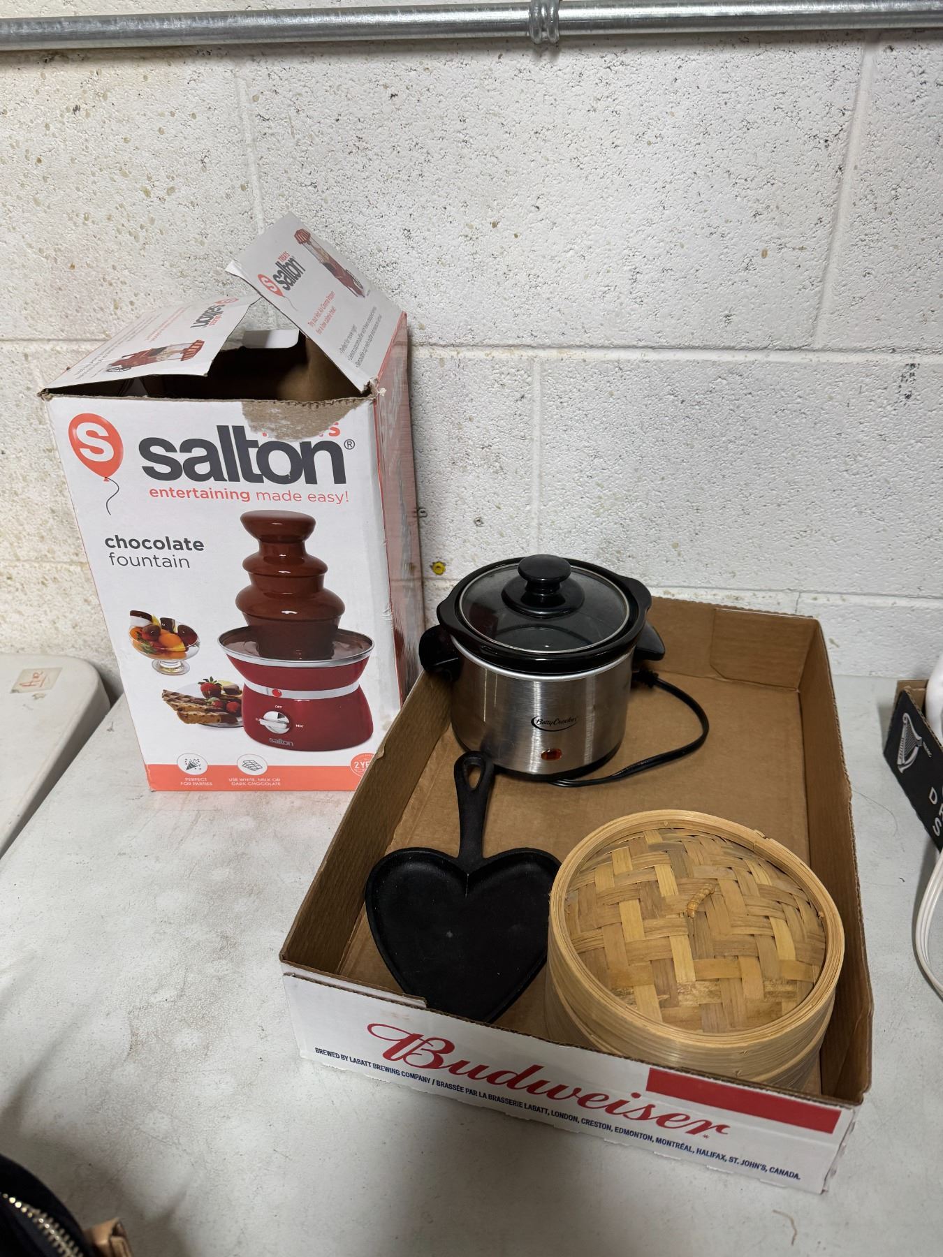 Small slow cooker, cast-iron pan and other and chocolate fountain