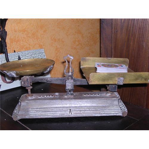Small balance d'epicier in cast iron with platters in brass, one round and the other square. Imported from the Mayenne region of France