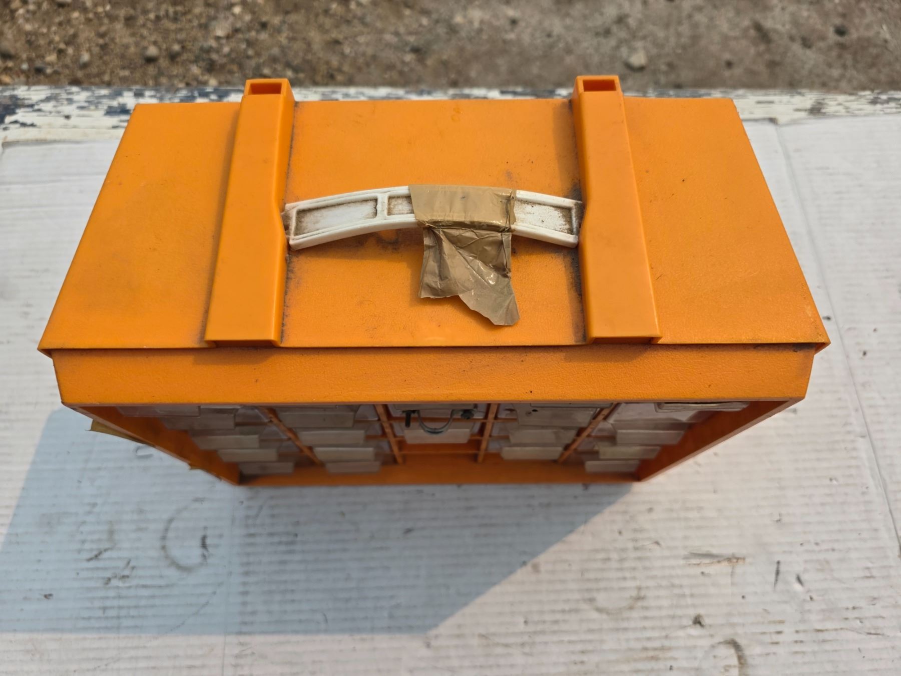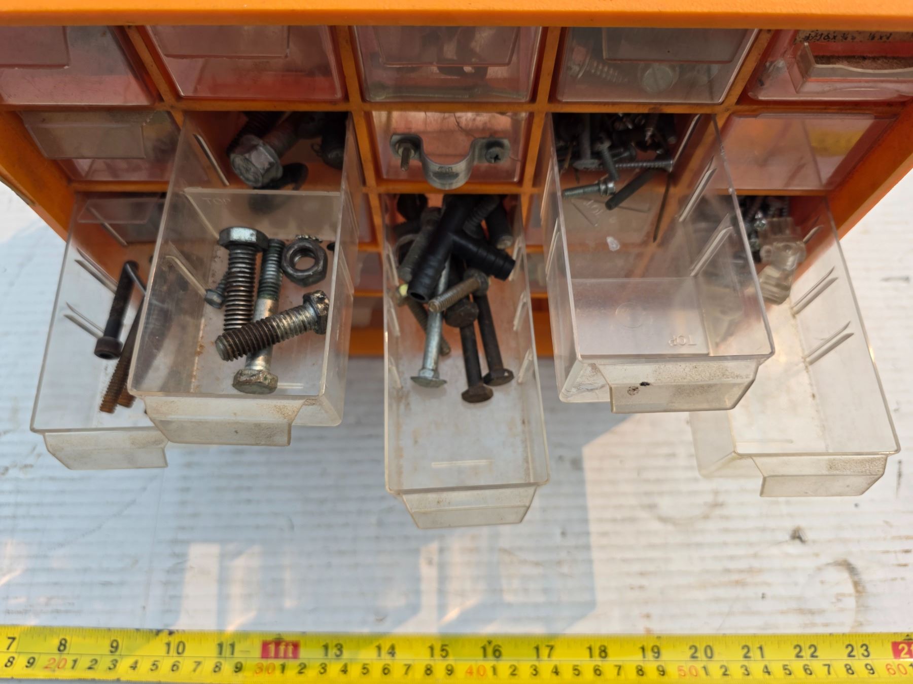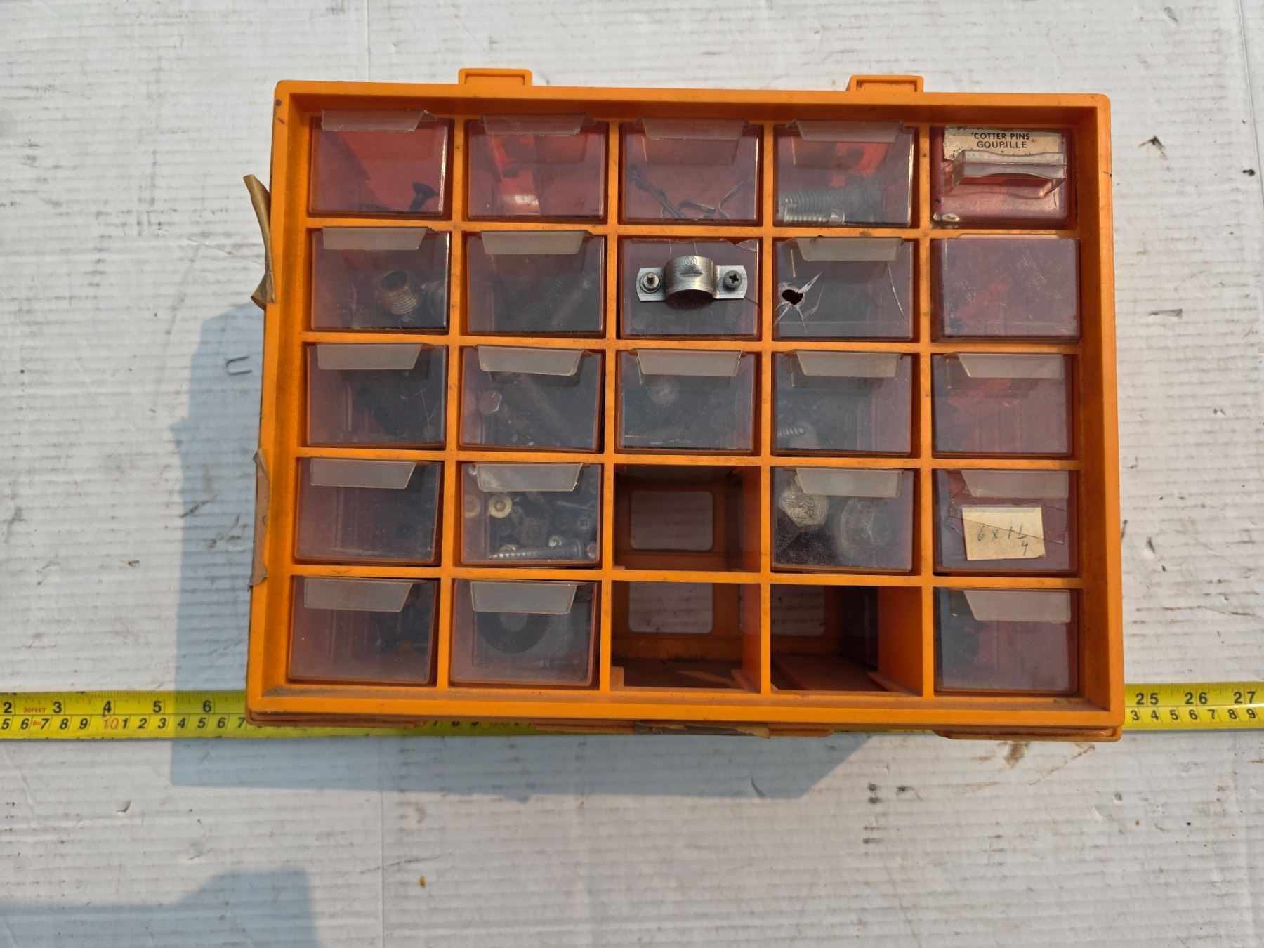 Small storage bin with parts