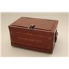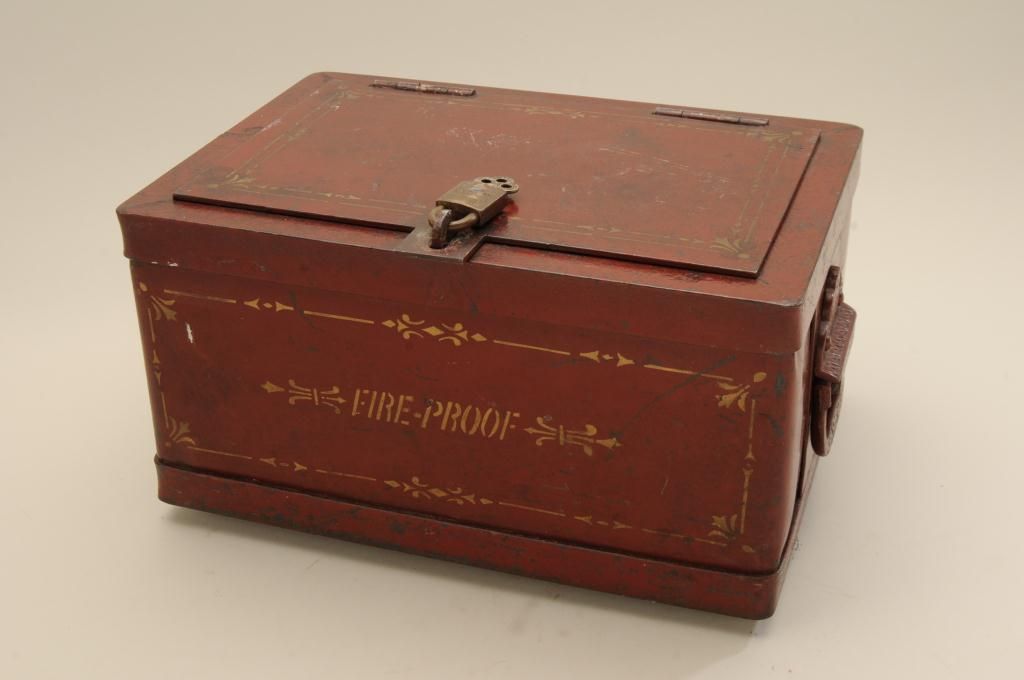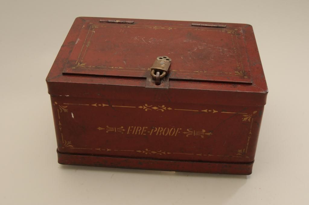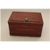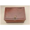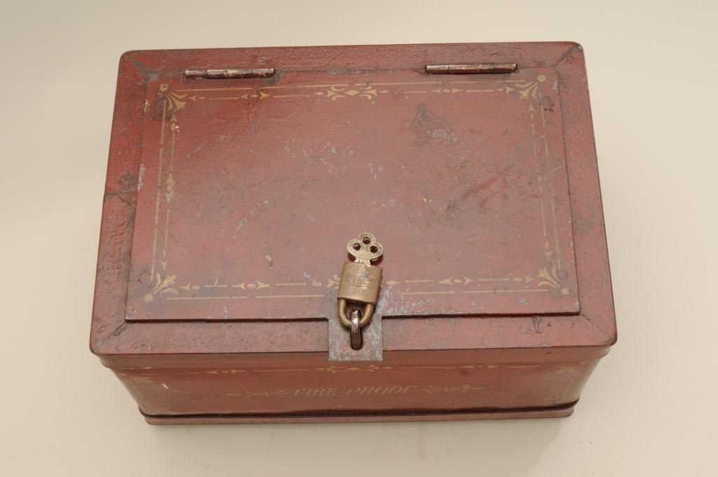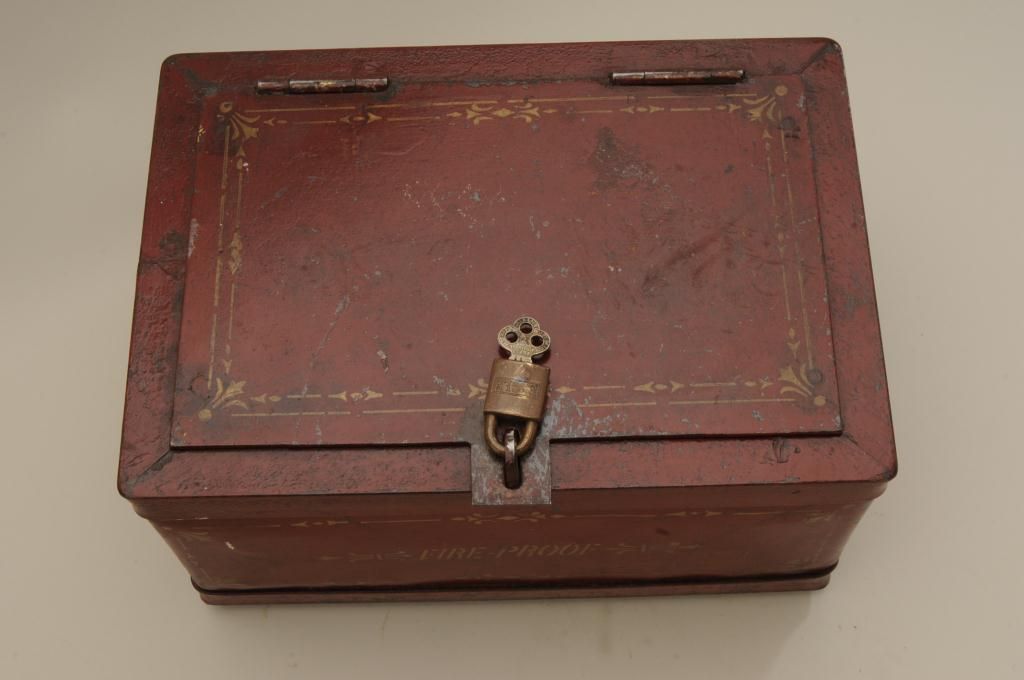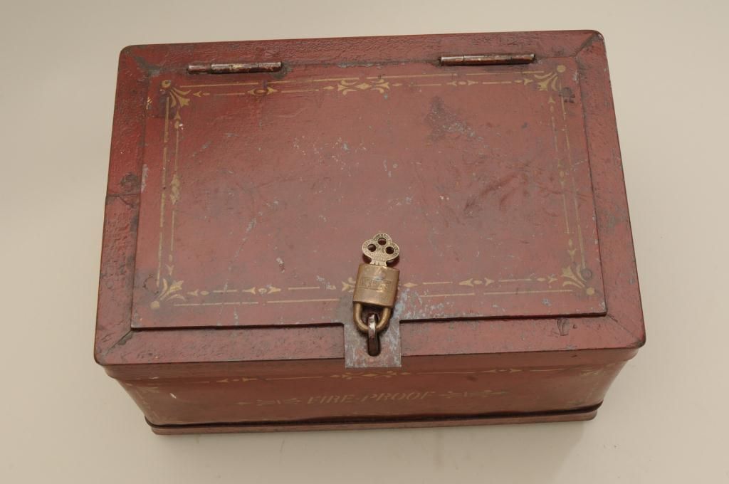 Small strongbox or personal vault circa late 19th to early 20th century showing old red paint and pinstripe decoration in good original condition. The vault measures 7” in height by 12 ¾” wide. An old lock and key isincluded. Est.: $250-$500