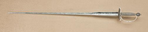 Small sword with ornate sterling silver and gold gilted hilt with reinforced triangular blade circa early to mid 18th century. The sword measures 39-1/4” with 32-1/2 blade, approx. 1” at widest portion of hilt, tapering to a point approx 7” from the hilt. The blade is lightly engraved with no maker’s signature, blade is in good condition with slight staining, normal aging. The hilt, guard, and pommel are pierced and show designs of stands of arms surrounded by floral and geometric formations. The grip is wrapped sterling silver with silver and brass wire. No visible hallmarks, traces of light gilt on the hilt, which is very sharp and crisp. Engraving well defined and considerable gilt on front of guard, sharp edges, not rubbed. The guard is slightly looses on the hilt. A very fine sword of the type carried shortly before and during the American revolution. Absolutely beautifully balanced. Est: $1,000 - $2,000