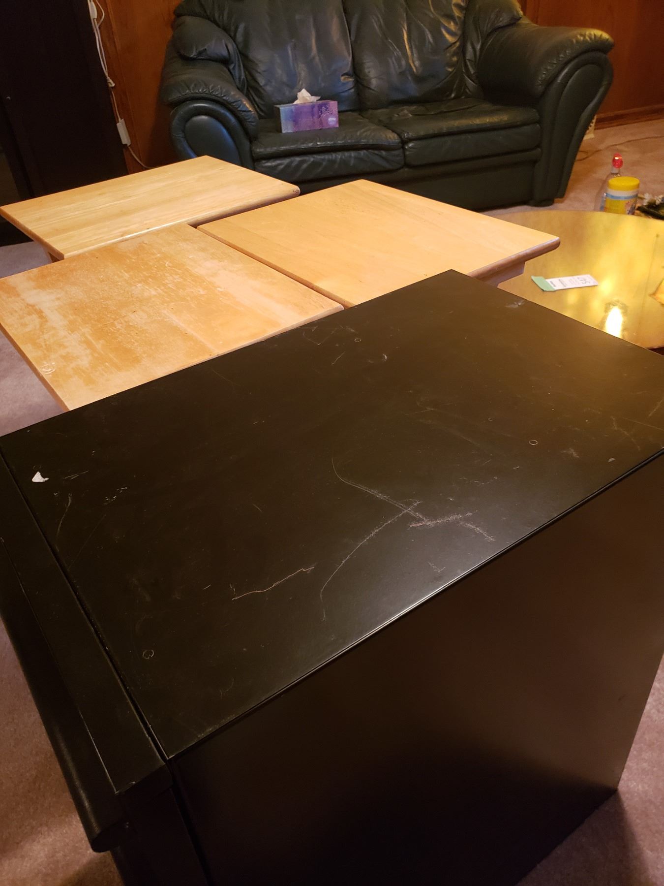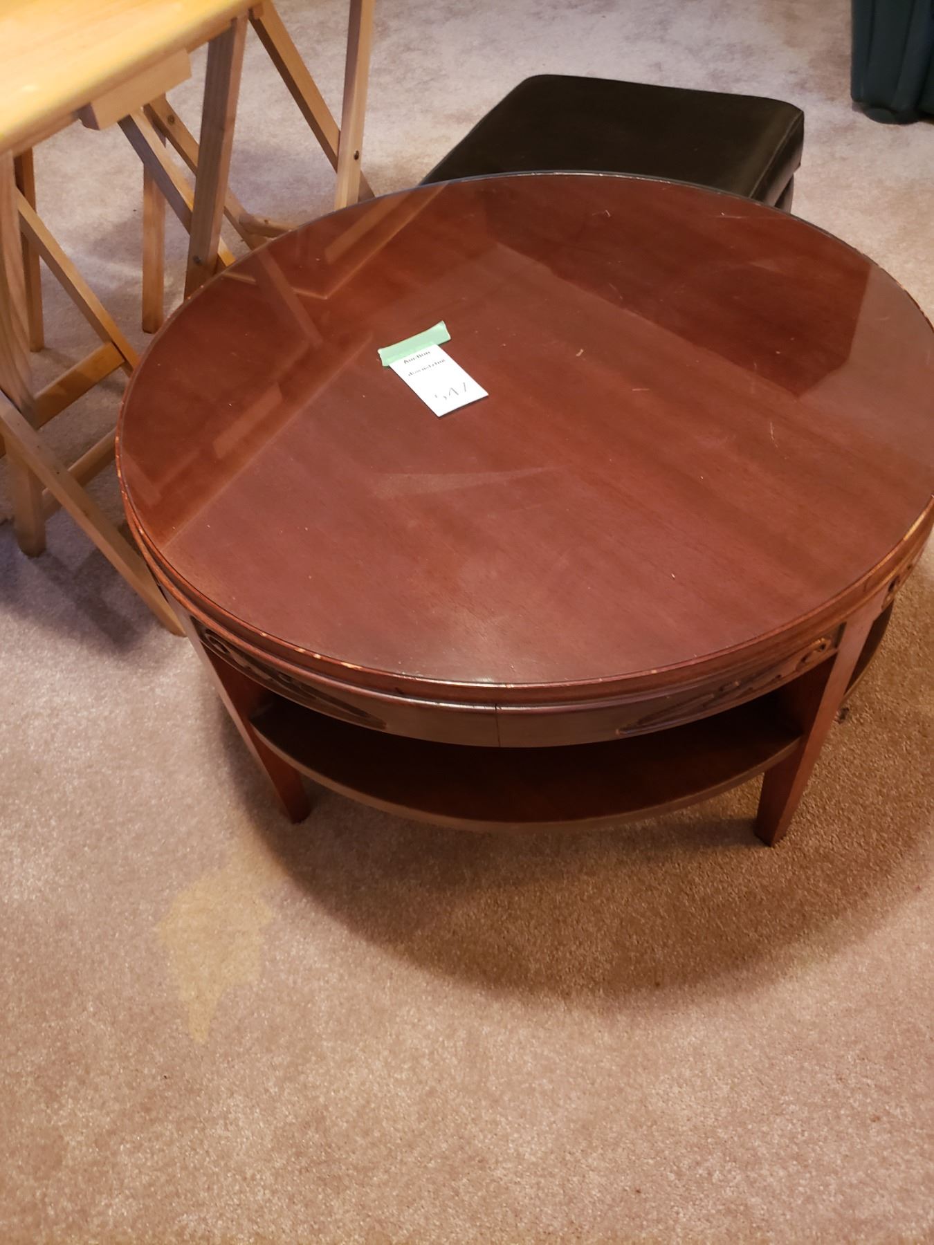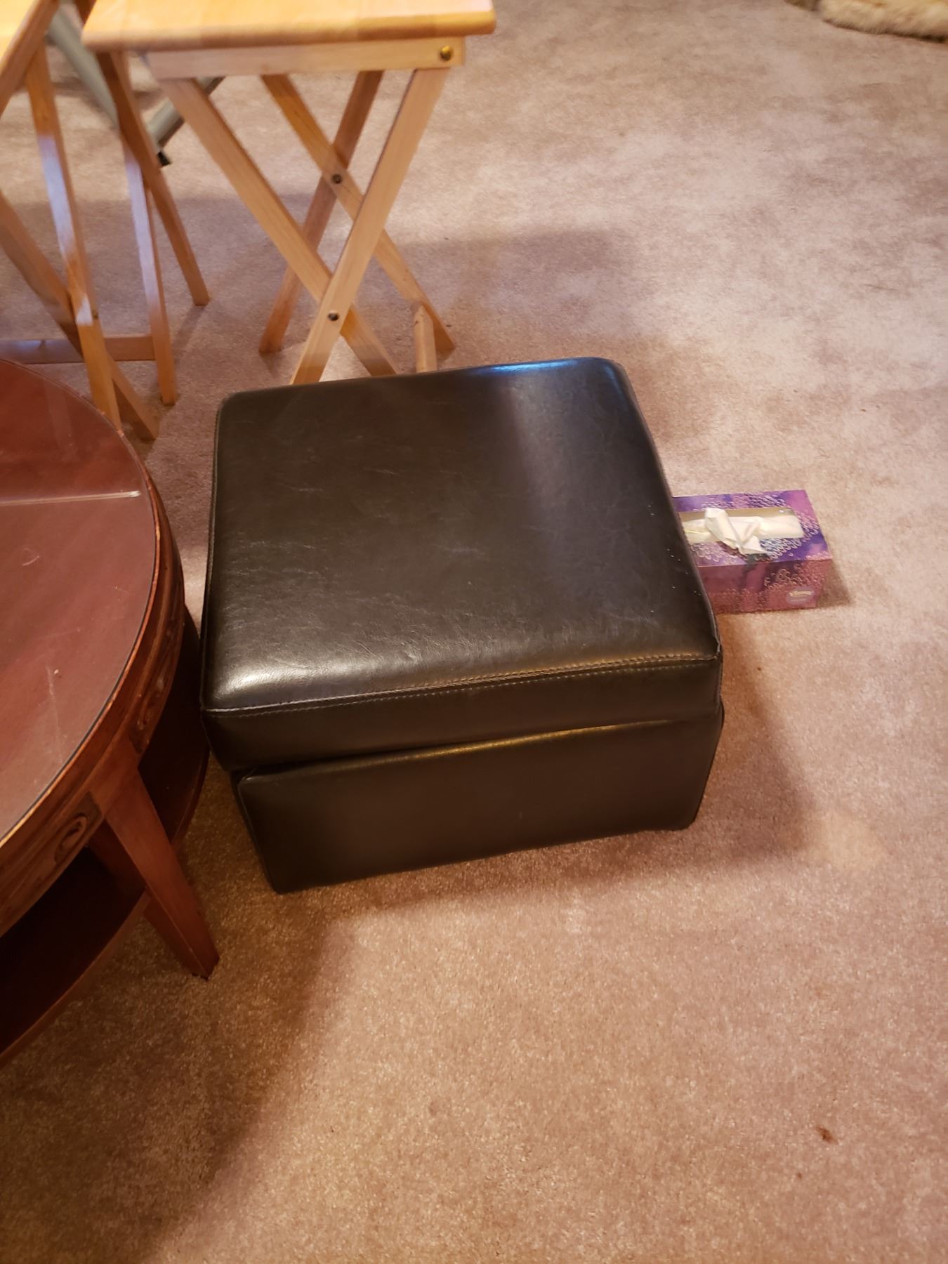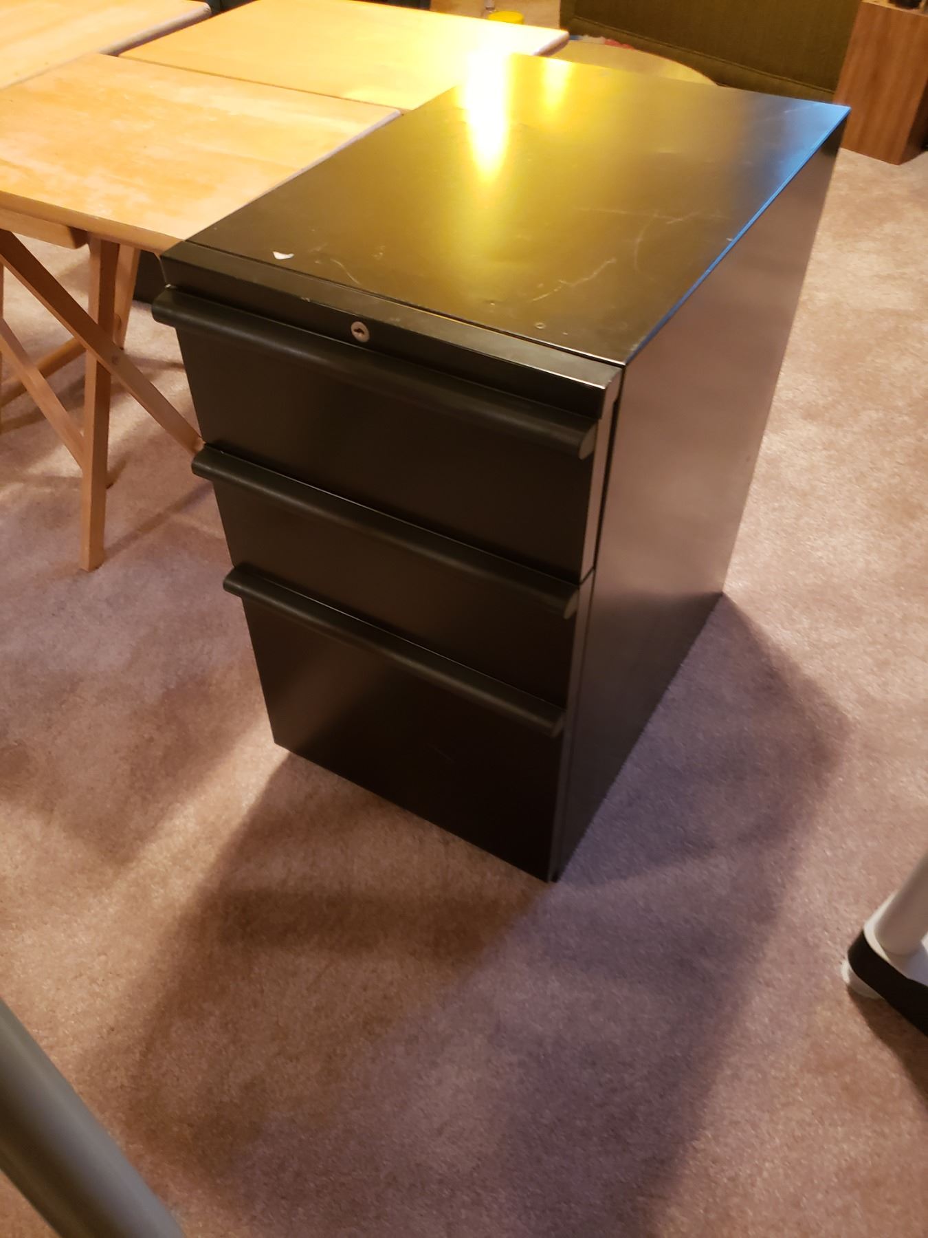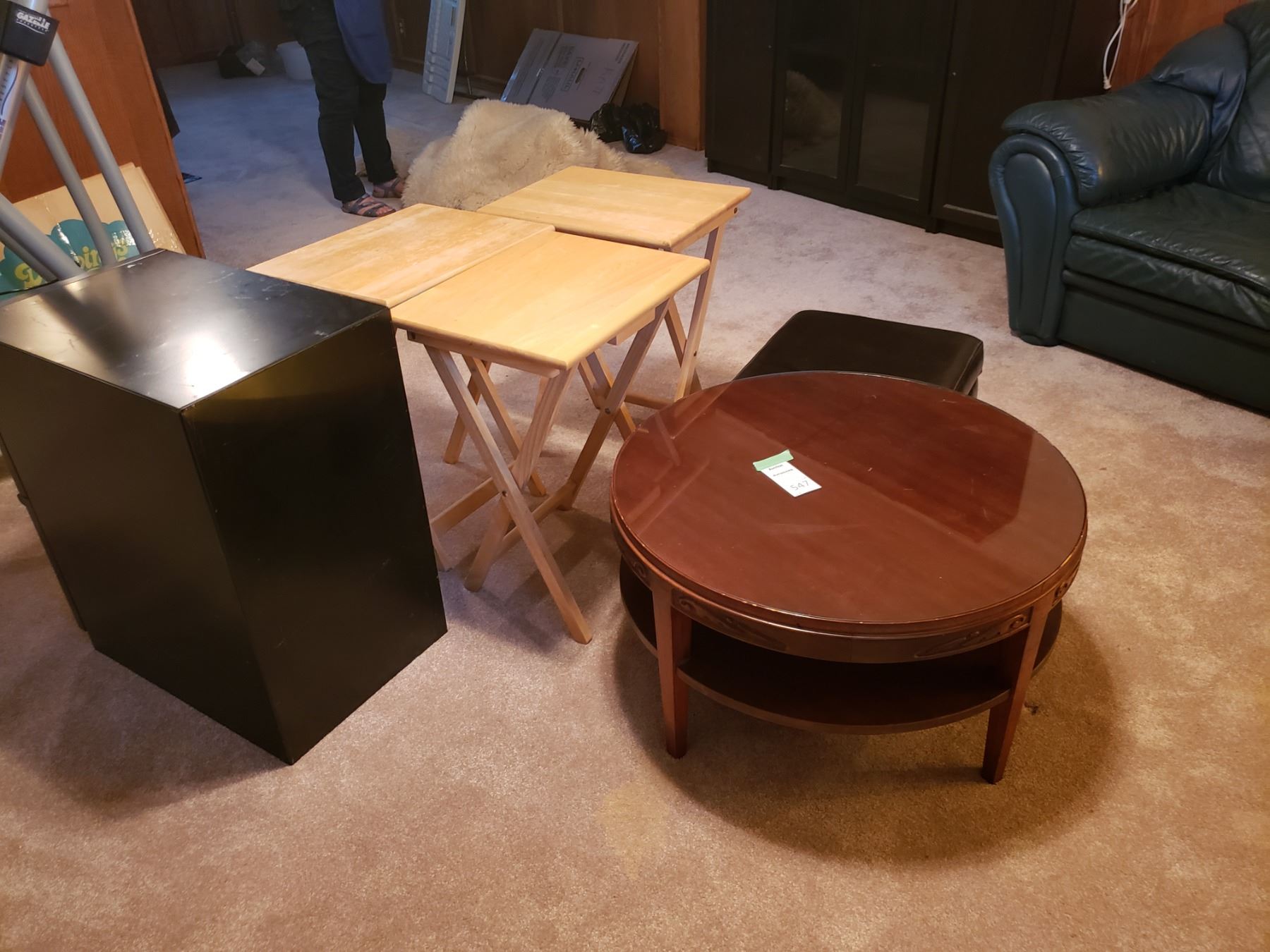 Small table 29x29x16, filing cabinet 15x23x26, 3 folding TV tables, and small ottoman included in lot. Filing cabinet heavy, bring help to move. Pickup in category C between 11am and 12pm.