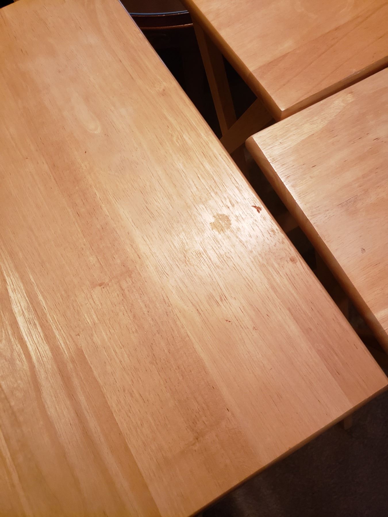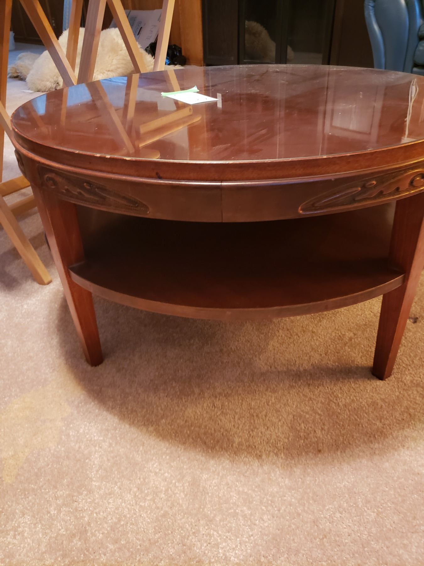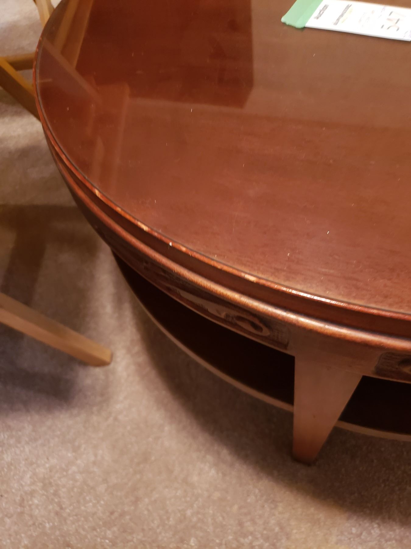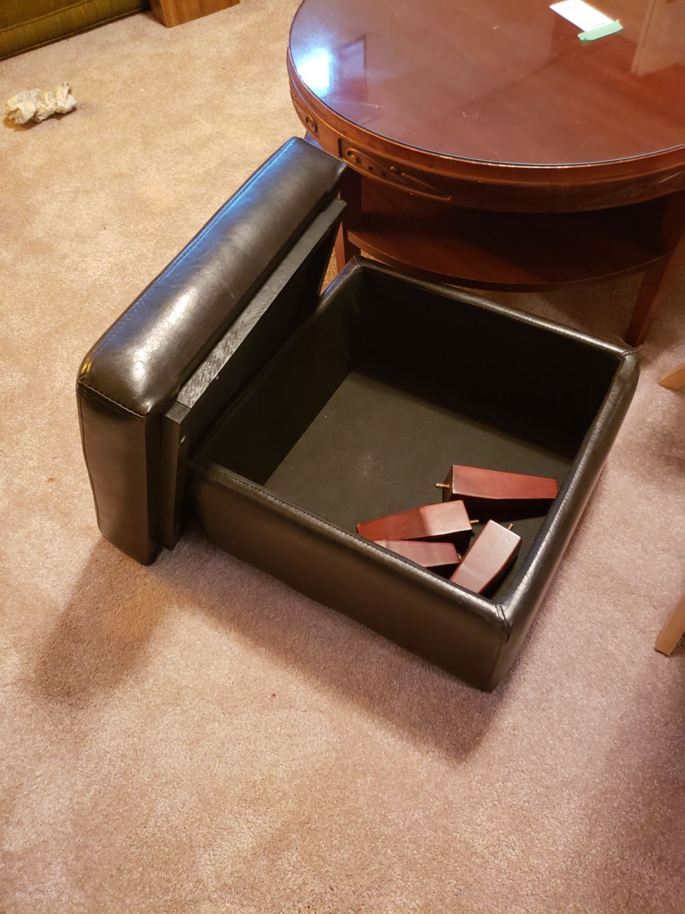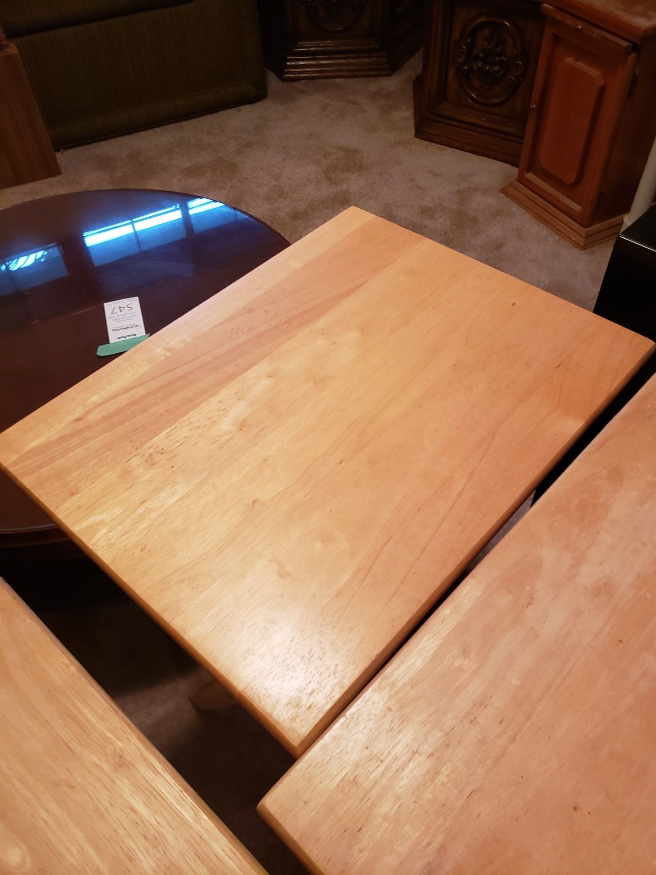 Small table 29x29x16, filing cabinet 15x23x26, 3 folding TV tables, and small ottoman included in lot. Filing cabinet heavy, bring help to move. Pickup in category C between 11am and 12pm.